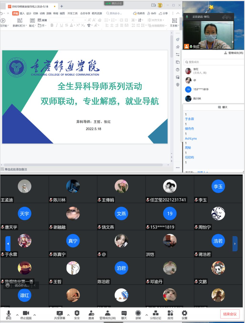 为更好践行我校全生异科导师文件精神,升华异科导师活动价值,5月19日中午,淬炼·国际商学院的异科导师张红老师与艺术传媒学院的异科导师王哲老师,以腾讯会议为媒介,与所指导的异科同学们,联动开展了线上就业指导活动。