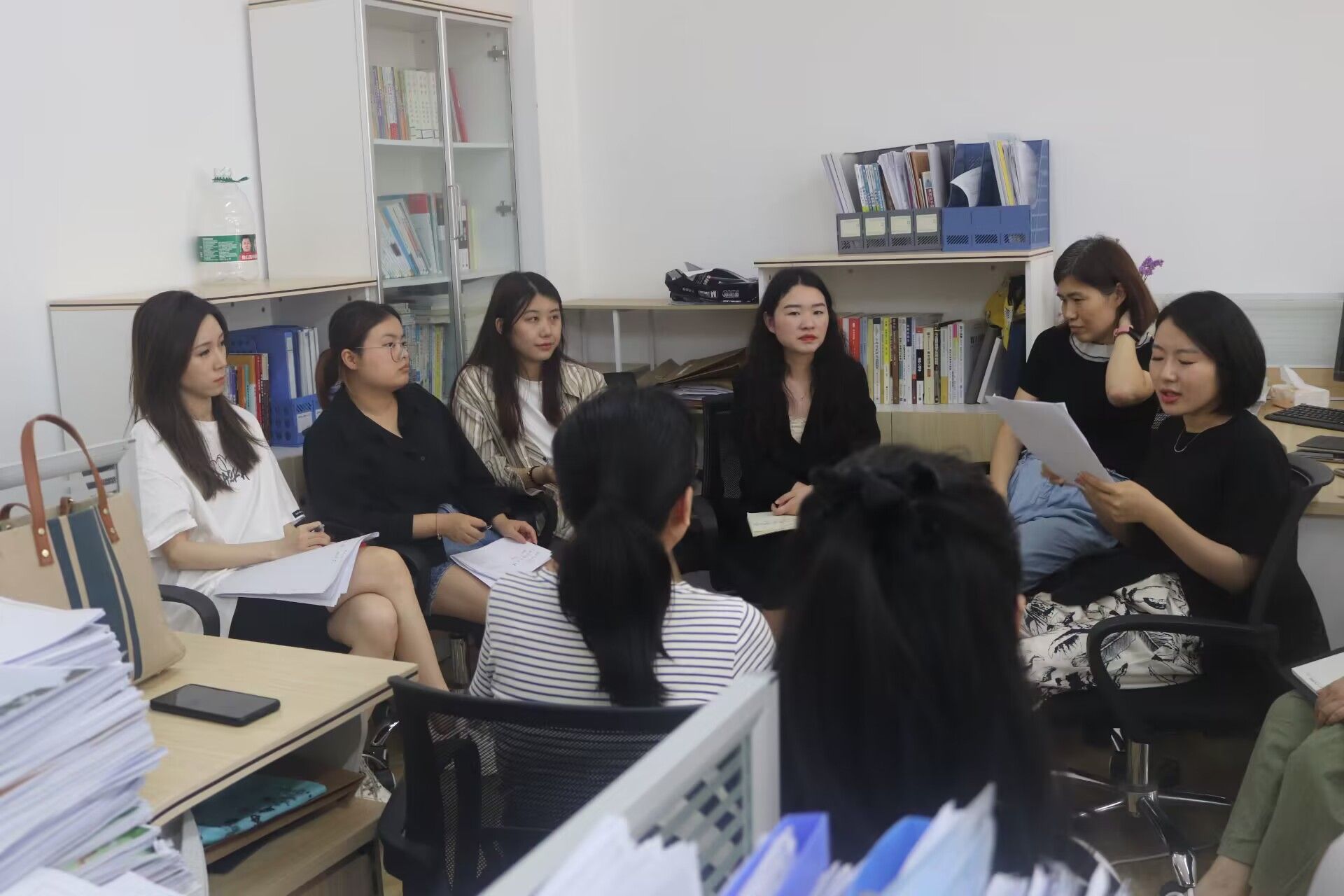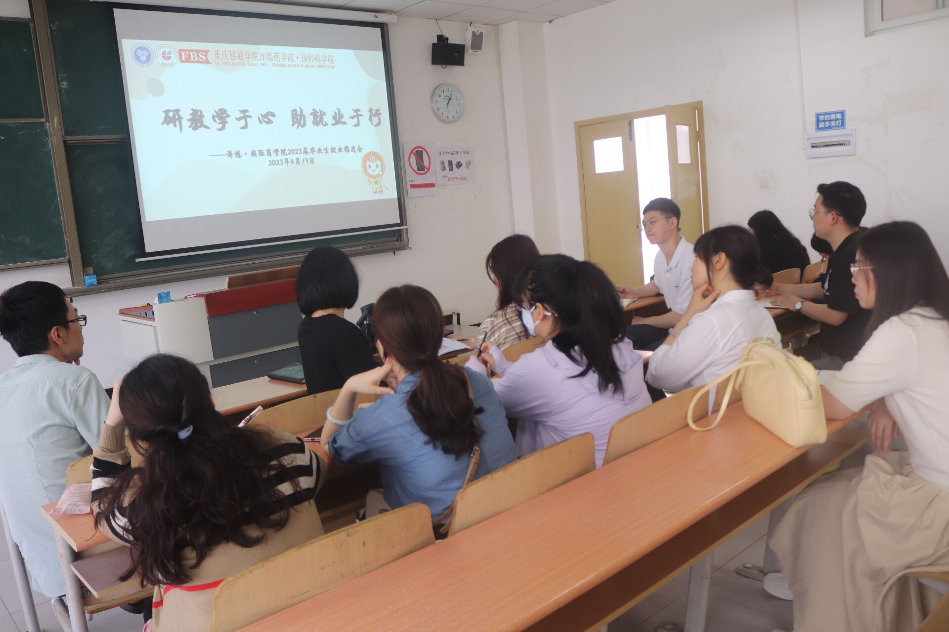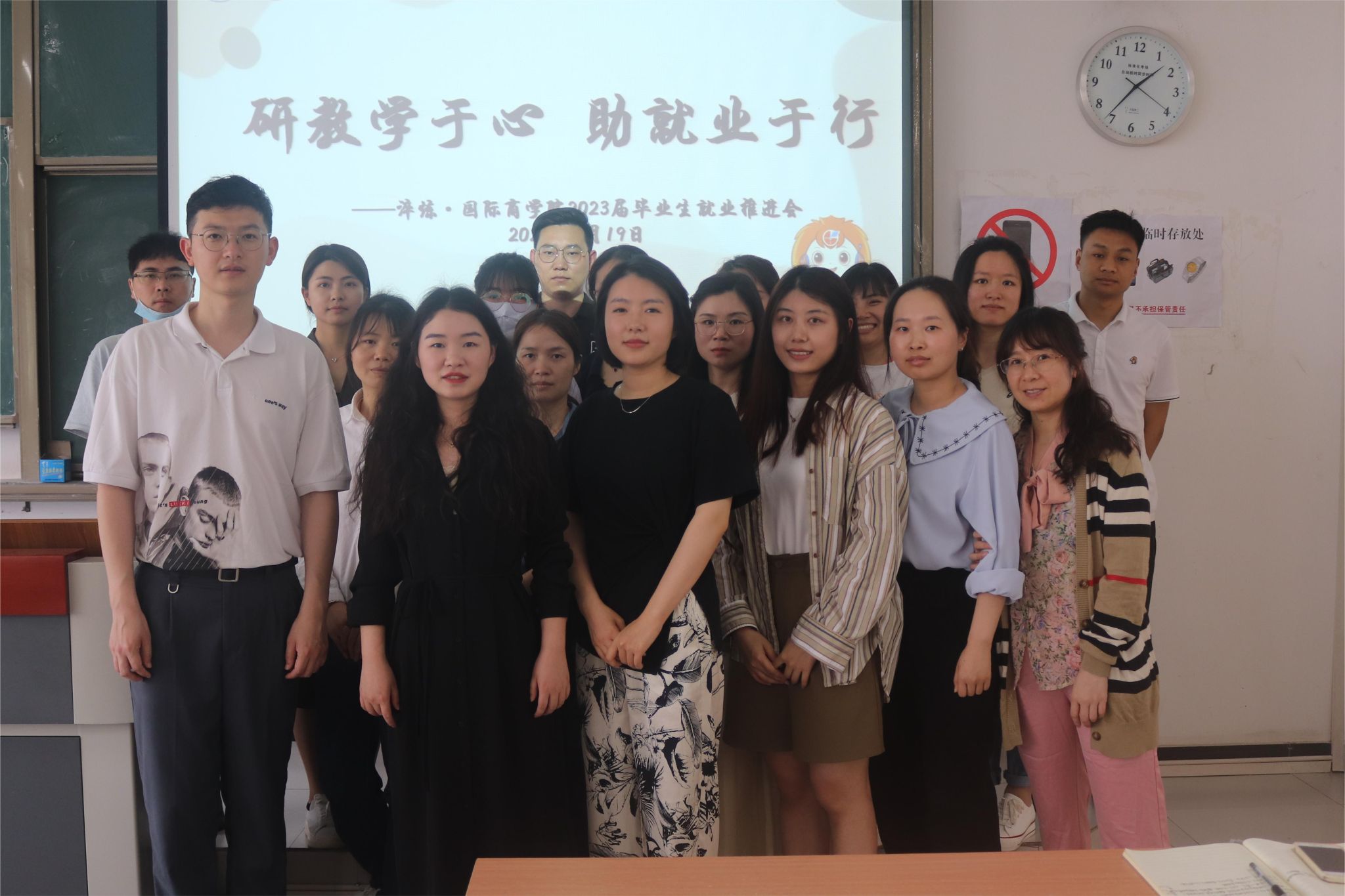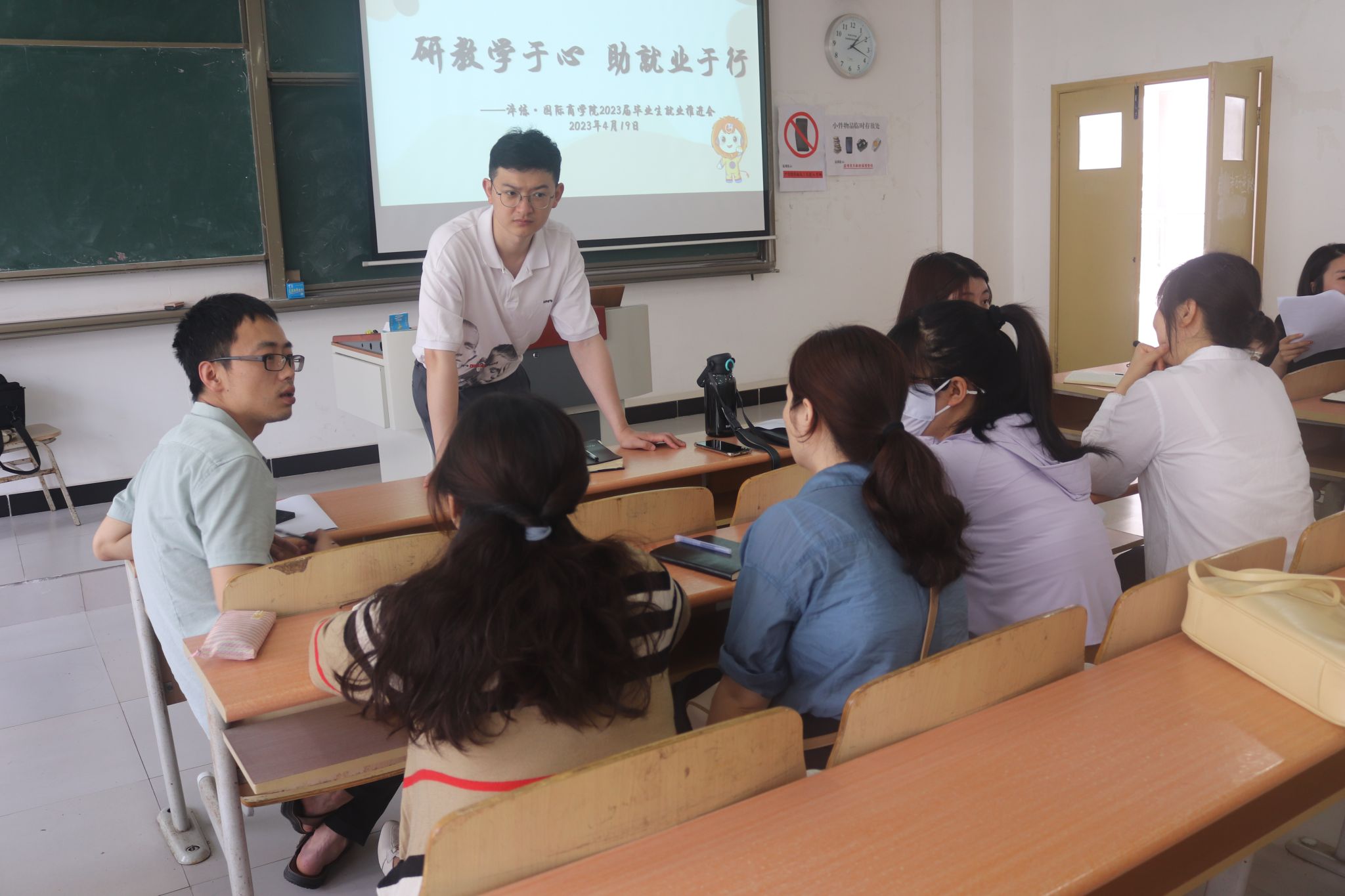 为深入学习贯彻党的二十大精神,落实党中央、国务院“稳就业”“保就业”决策部署,切实做好我院2023届毕业生就业工作,引导毕业生把握住就业机会,高质量就业, 4月19日,淬炼·国际商学院开展“研教学于心 助就业于行”为主题的就业推进会,本次会议在第五教学楼5405和第八教学楼市场营销教研室顺利召开。本次会议有市场营销教研室主任寇小玲老师、工商管理教研室主任杨宝石老师、就业创业工作办公室主任杨伦芳、以及毕业班辅导员叶洵、杨子莹老师及部分教研室老师代表参加本次会议。