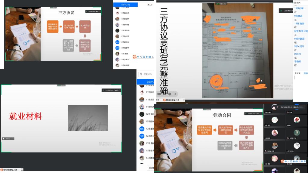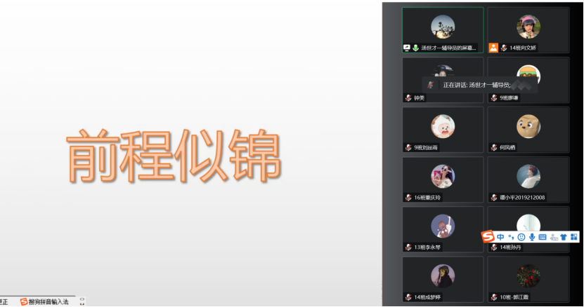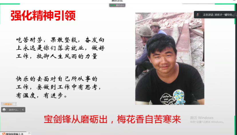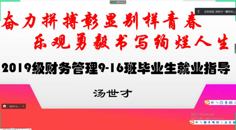 就业是经济的“晴雨表”,是社会的“稳定器”,也是民生的“压舱石”。促进大学生就业创业是重要的民生工程,关系到学生的切身利益和社会的和谐稳定。为了做好毕业生就业工作,采取有效措施推进学生就业创业,12月3日,因疫情原因,淬炼商学院辅导员汤世才老师采取线上的方式,在腾讯会议召开了“奋斗拼搏彰显别样青春,乐观勇毅书写绚烂人生”为主题的2019级财务管理9-16班毕业生就业工作指导大会。