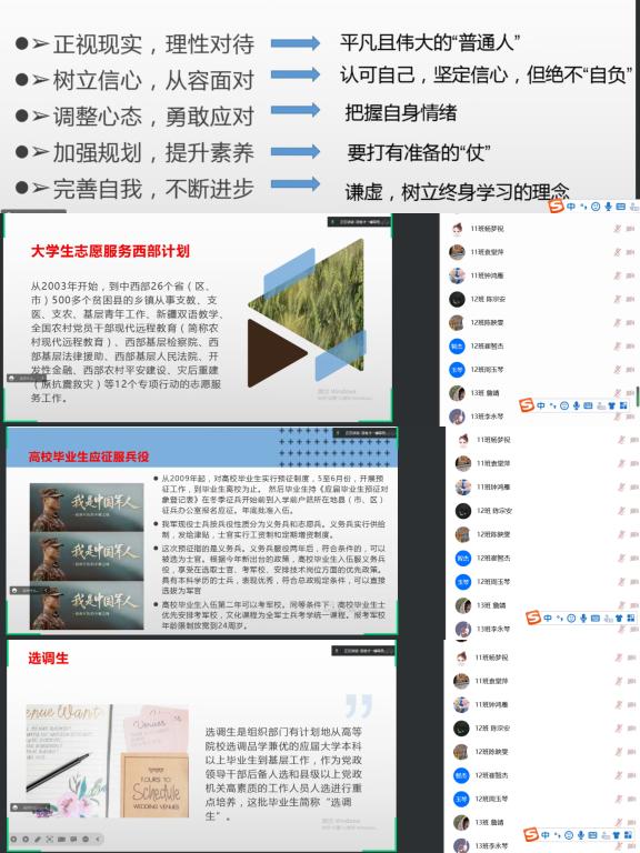 刘庸说过一句话:“人生就如一杯茶,不能苦一辈子,但总要苦一阵子。”在最苦的时候,请对自己负责,你的命运掌握在自己的手中,只有对自己负责,你才能让自己体会到苦后的甘甜。汤老师通过分享自身的经历,鼓励同学们要强化思想引领,不忘初心,砥砺前行。就业不止是找到工作这么简单,而是包含就业前景、就业能力等方面。汤老师首先为毕业班学生分析了当前就业形势及职业生涯规划。当前受疫情影响,各行各业经济滞停,就业难度加大,行业内卷严重导致工作难找,汤老师为同学们剖析了原因以及引导毕业班学生应该要有健康的就业心态,及时做好自身职业规划,了解当地就业政策,在当前就业难的前景下,从多渠道,多方向,找到心仪的工作,例如:三支一扶、西部计划等,为自己的的前程负责。