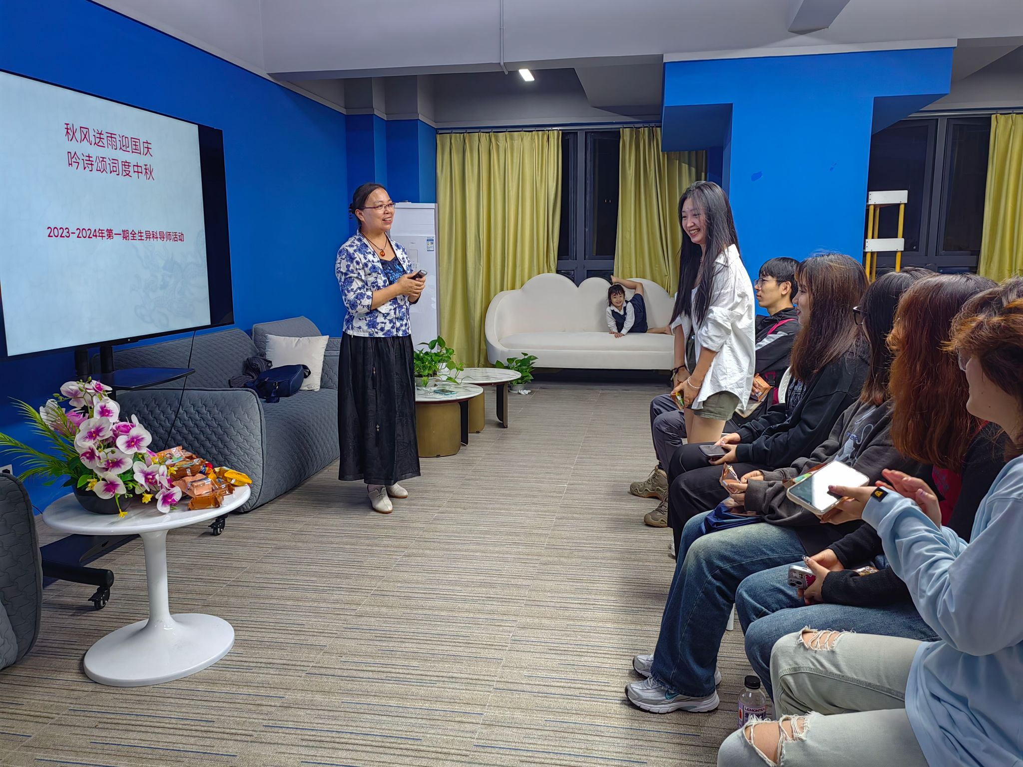 为弘扬传统文化,增进同学友情、连线师生交流渠道,9月25日晚淬炼商学院全生异科导师李红艳、彭润亚两位老师在天空书院浩瀚家文化体验室联合组织学生发起了一场别开生面的“对诗歌迎双节”的交流活动。