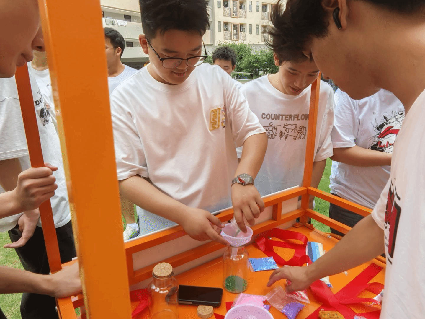 在 “情绪天气瓶” 环节,透明玻璃瓶、七彩沙粒与折纸工具成为情绪的具象载体。现场,沙沙的落沙声与折纸的窸窣声交织,同学们用色彩与造型传递心境。有人以蓝色沙粒打底,搭配纸折星星,实现色彩碰与心情的共鸣。营销 3 班孙同学感慨:“看到不同色调和组成的瓶子,突然觉得郁闷的情绪有了分担”。