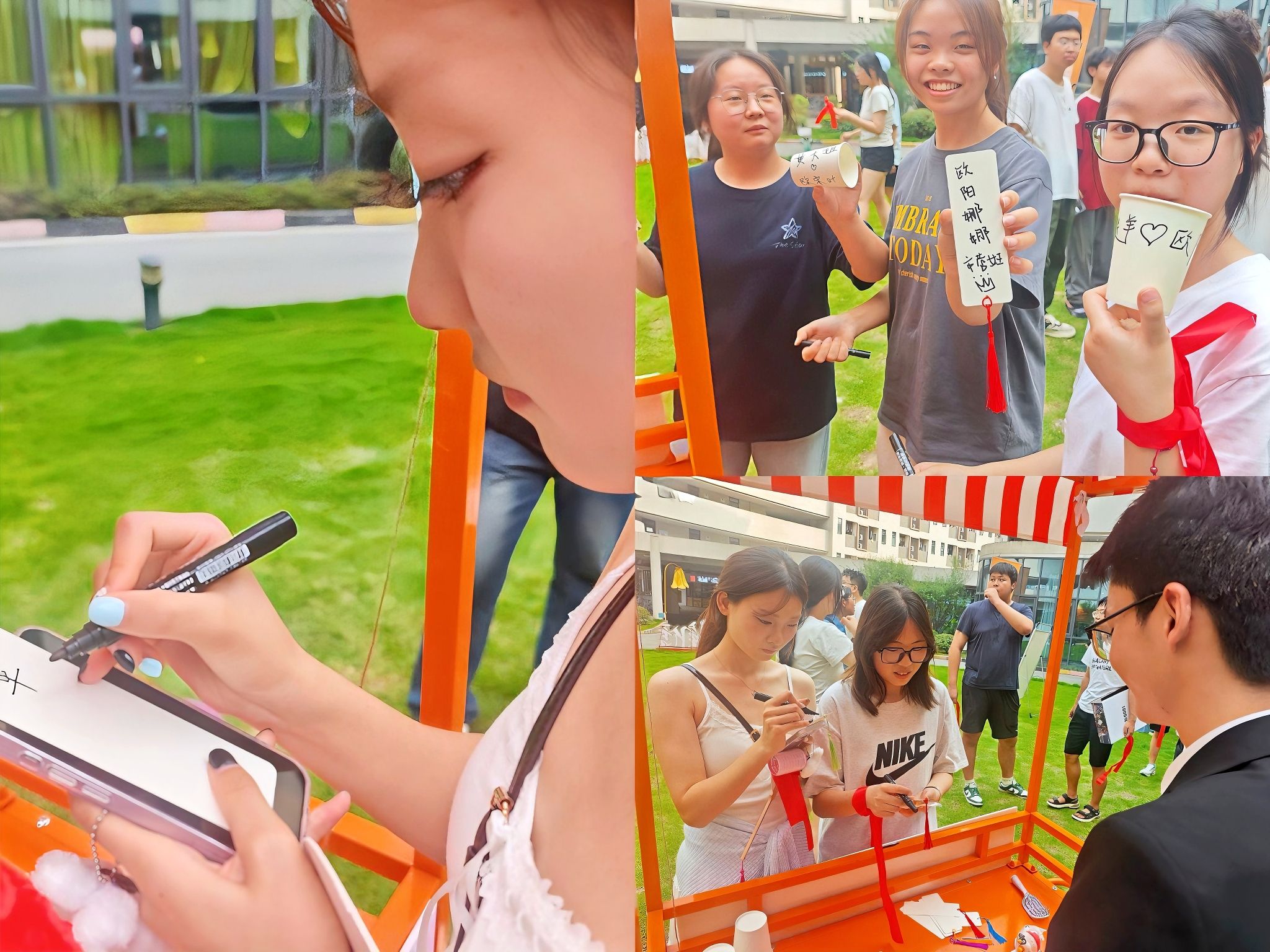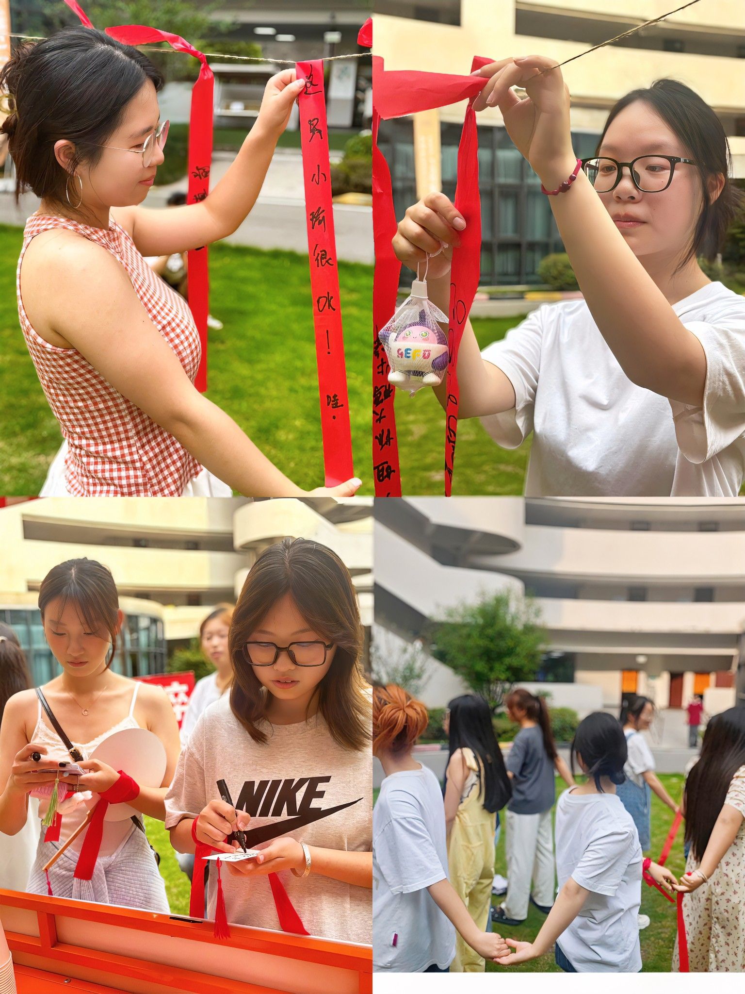 “打开心结” 环节以红丝带搭建倾诉桥梁。同学们用黑色马克笔在30cm的红色丝带上书写对未来期许,例如“想上魔王S”“来财来财”“旅游世界” 等字迹错落悬挂于丝线上。微风吹拂,丝带上的字迹随风轻晃,似在诉说着青春的热烈渴望。随机抽取分享时,现场笑声与鼓励声交织,让每一份期许都被认真聆听与回应。