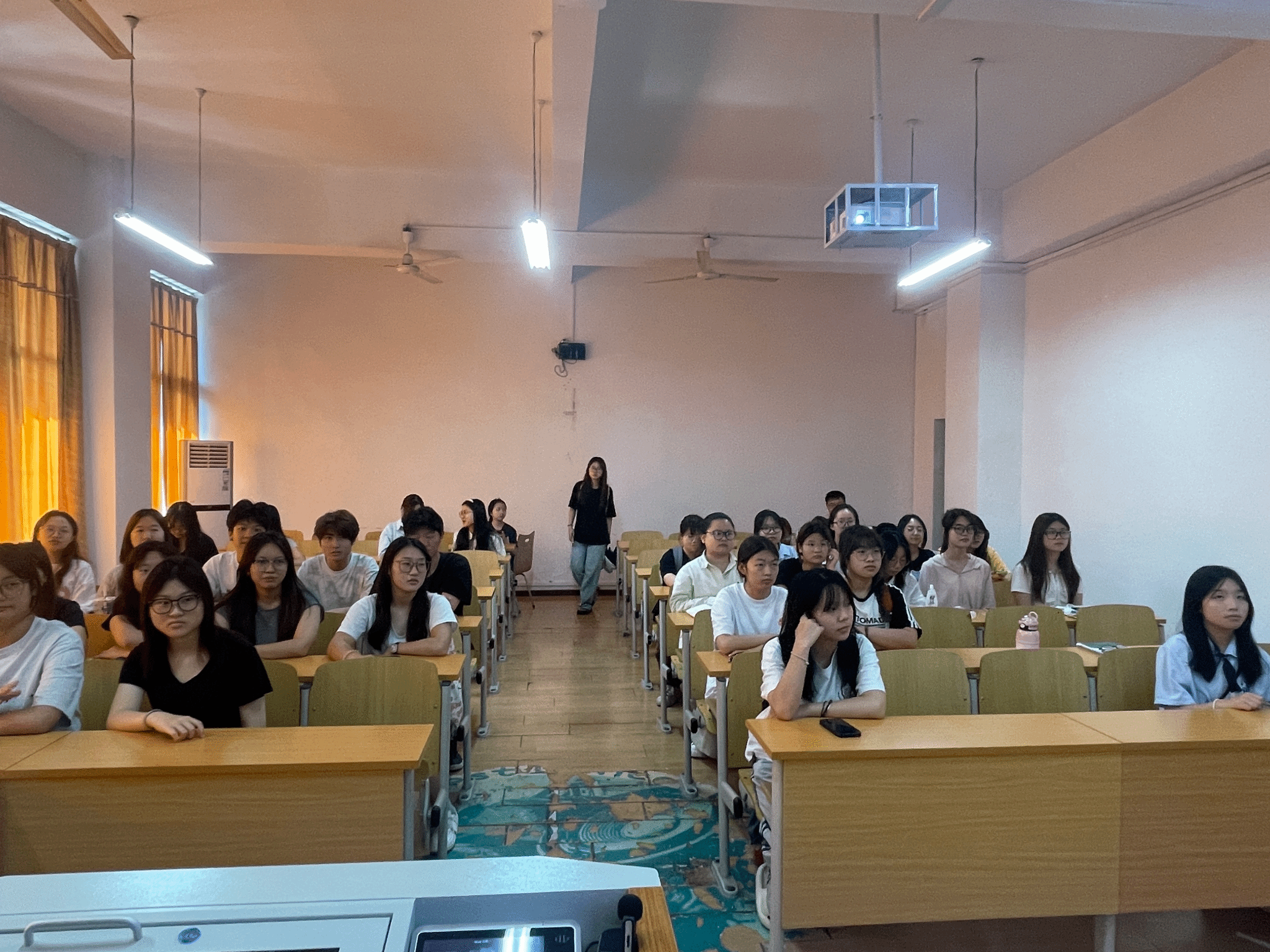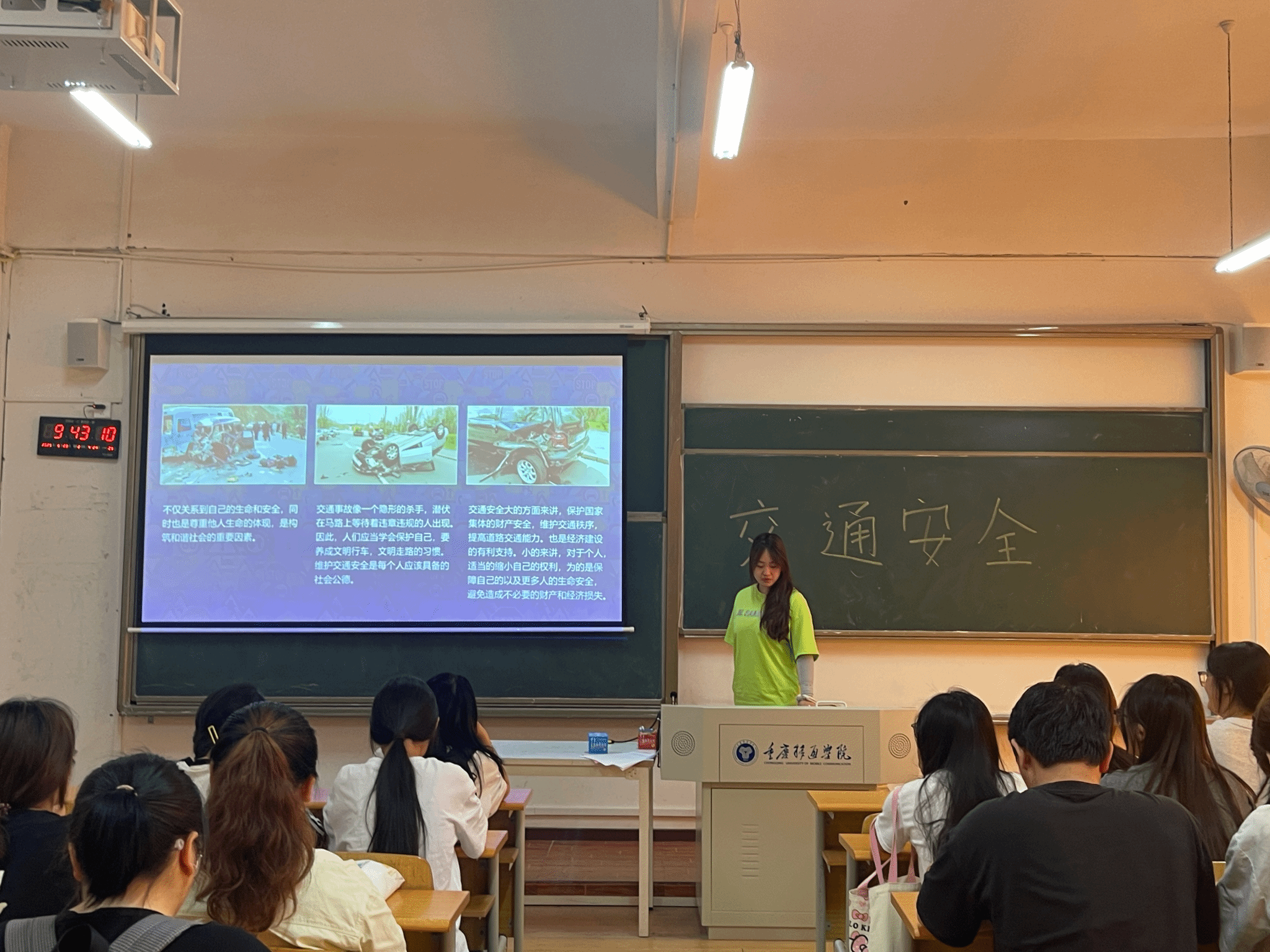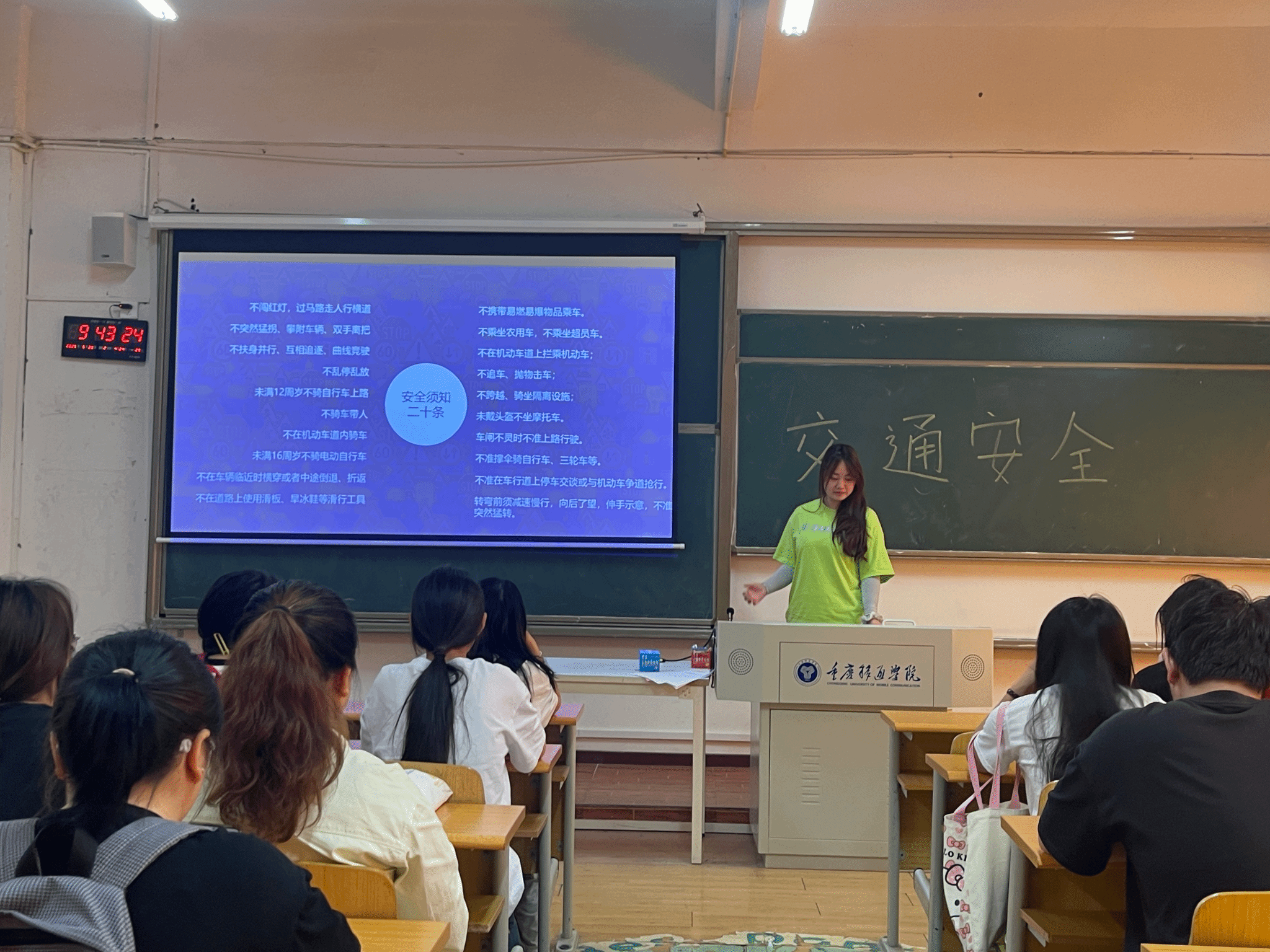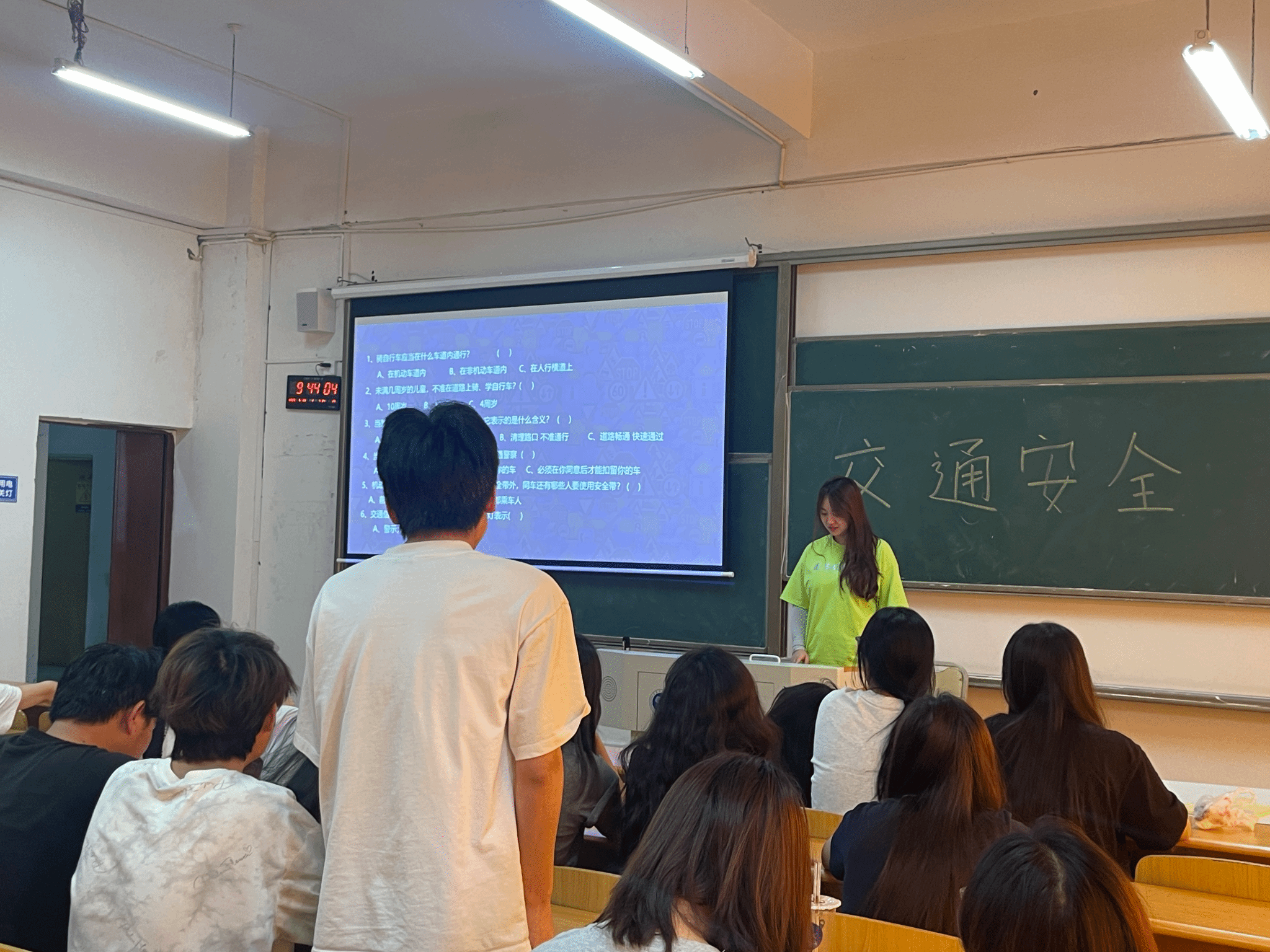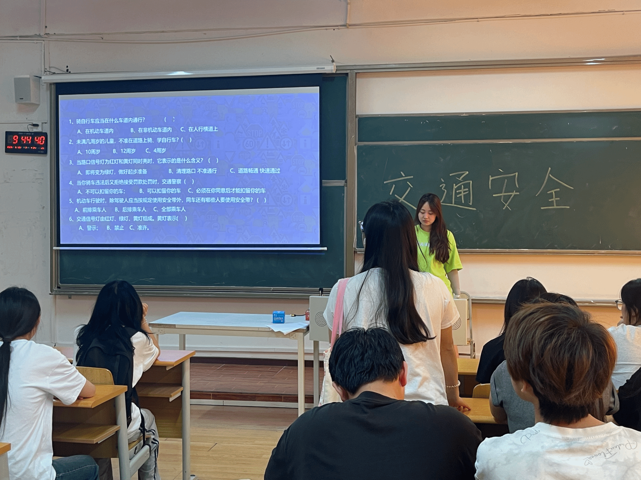 班长详细介绍了安全出行必备常识,涵盖在道路上行走、骑车、乘车等方面的注意事项;为增强应急处置能力,此次活动专门设置“危险场景应对”环节。班长结合PPT内容,演示了地铁与公交车事故的自救方法,随后的交通安全知识小测试与交通标识解读,以“非机动车道通行”“黄灯含义”等6道选择题及4类标识辨识,检验了同学们的学习效果,巩固了“知危险、会避险”的安全技能。