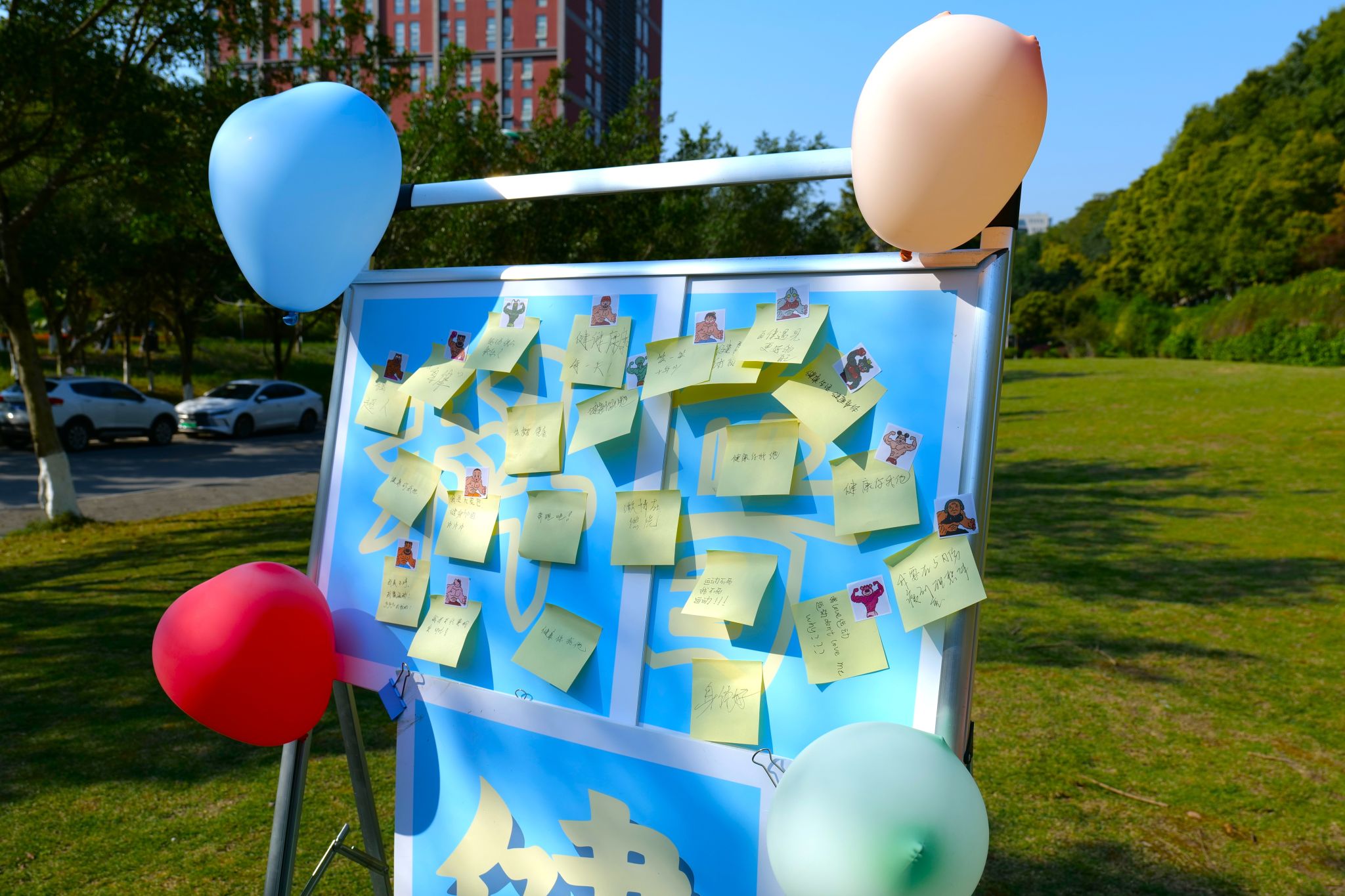 分享结束后,活动进入创意签到环节。同学们在定制便签上书写个性化健康目标。“每天23点前睡觉”“每周跑步3次““告别奶茶”等承诺贴满展板,形成色彩斑斓的”健康星空“。紧接着,现场抽签分组,各小组成员拿到定制运动绑带,为自己的队伍起出霸气响亮的名字,展现团队独特风采。罗帅学长化身健身教练,带领大家完成”开合跳+高抬腿”组合训练。随着动感音乐响起,同学们热情高涨,原本整齐的队列逐渐演变成欢乐的海洋。