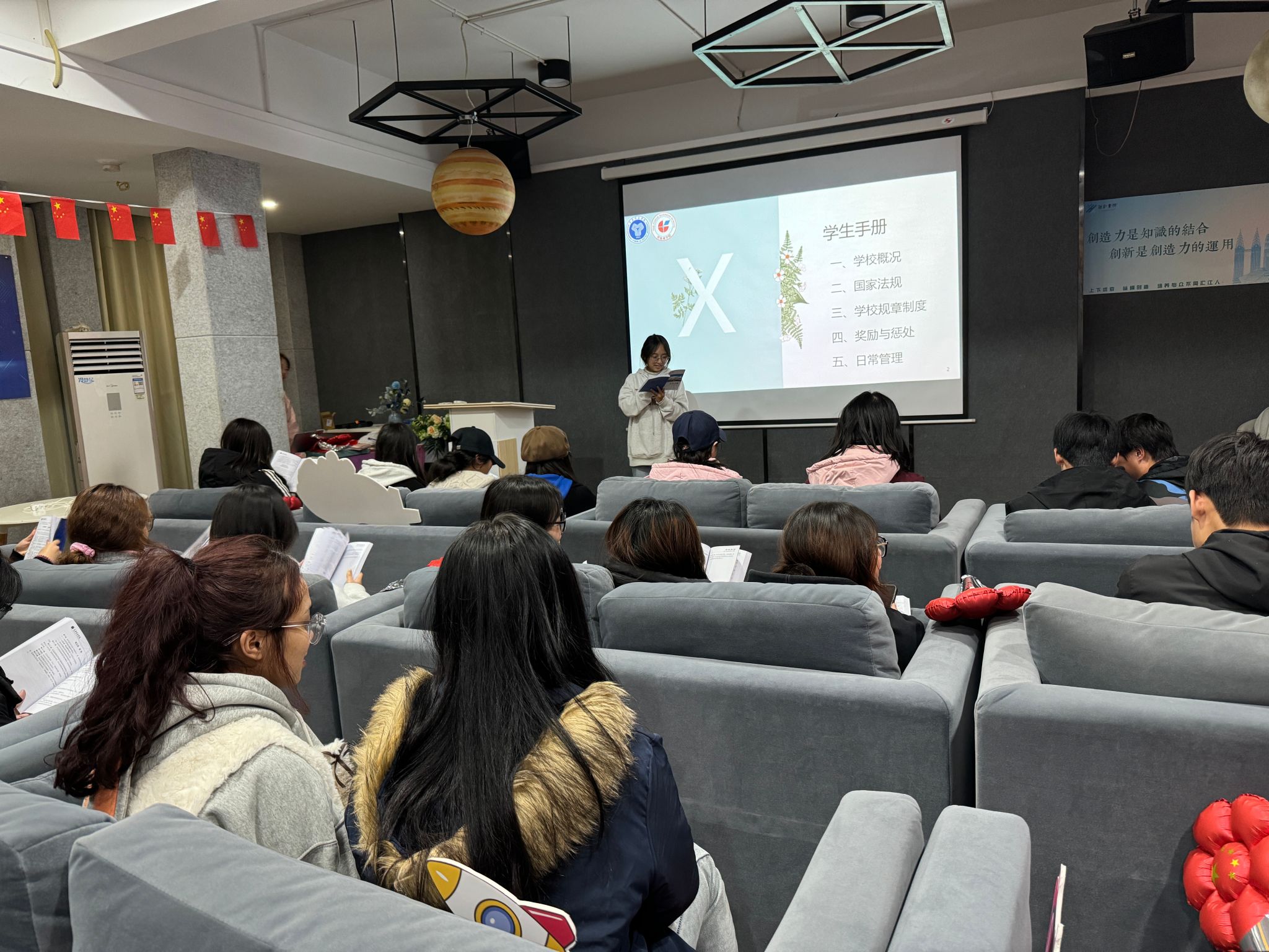 活动伊始,在学习委员袁莎莎的带领下拿出学校为我们发放的学生手册进行学习。映入眼帘的是我们学校的简介,我们学校秉承“乐教、乐学、创造、创业”校训精神,在教育的广袤天地里独树一帜。在这一校训精神的光辉照耀下,学校的每一个角落都弥漫着积极向上、勇于探索、敢为人先的浓厚氛围,为师生们的成长与发展注入了源源不断的活力与动力。学校构建了“四位一体”(完满教育、通识教育、商科教育、专业教育)双院制+特色课程的人才培养模式,让同学们的学习和生活都能获得全方位的滋养与独特的成长体验。让同学们感受到浓浓的归属感与温暖,这种双院制打破了传统教育模式的局限,将学习与生活紧密融合,塑造出全面发展、富有个性与创造力的新时代青年,为同学们的未来人生之路铺就坚实且多元的基石。
