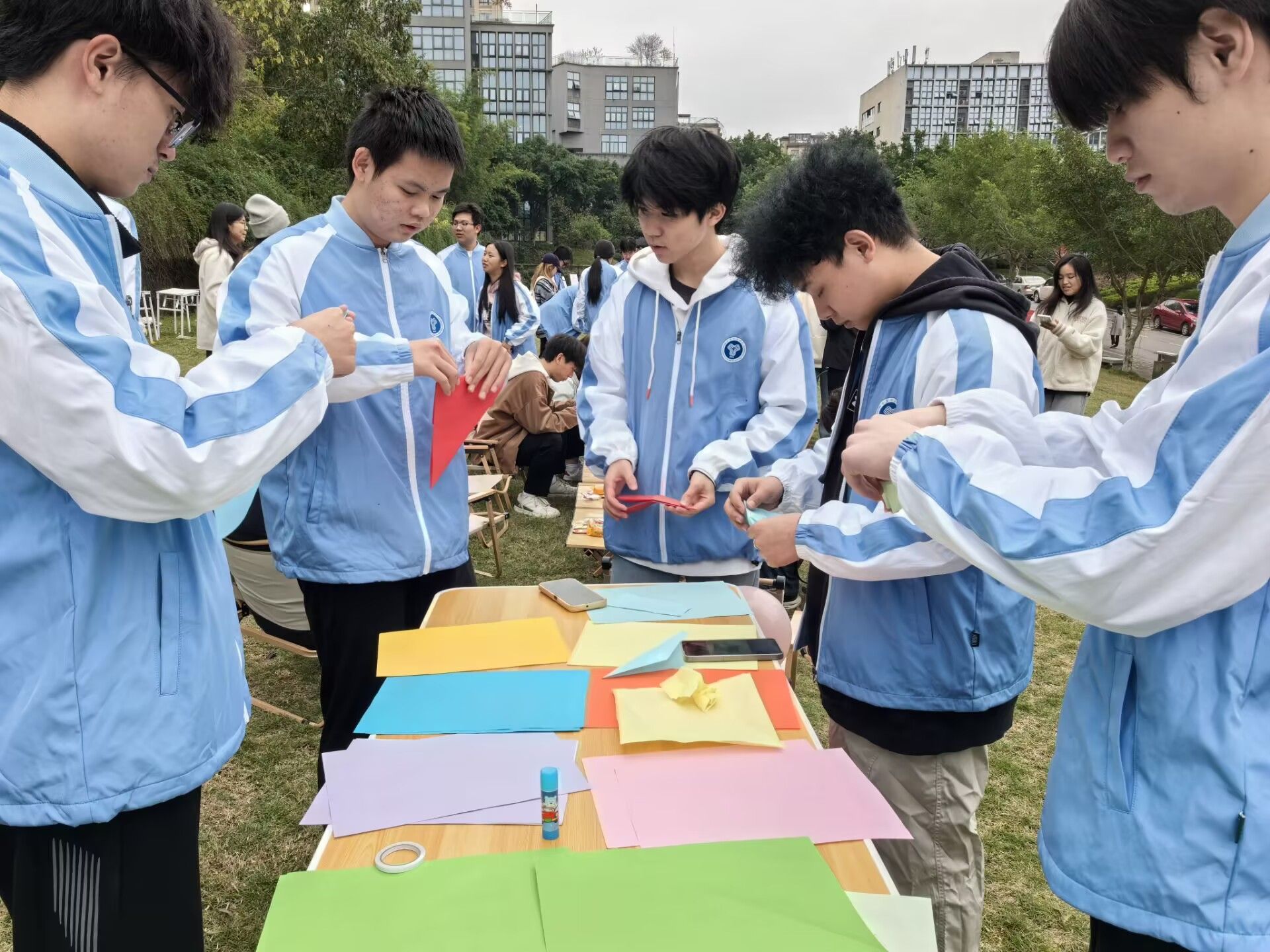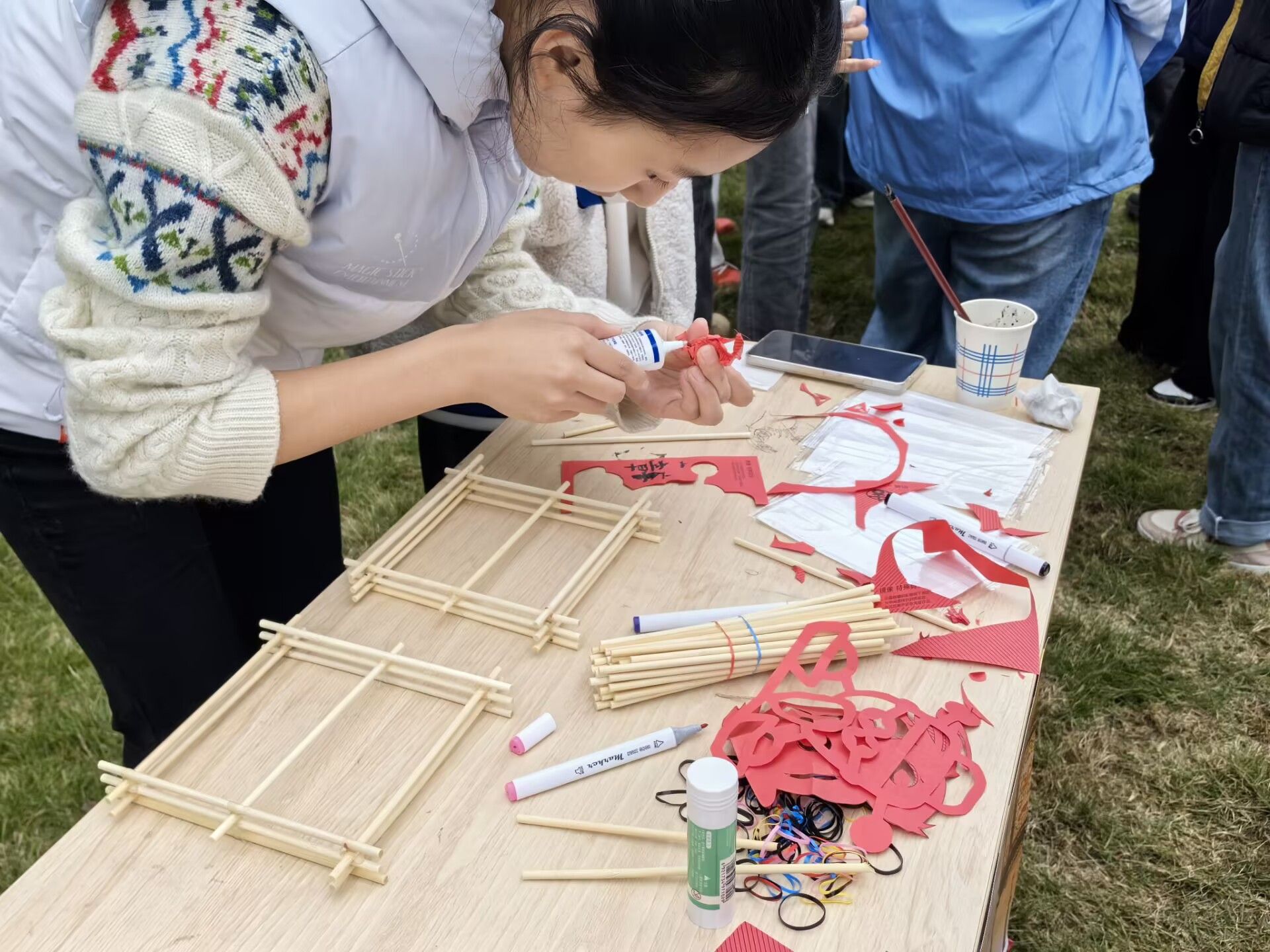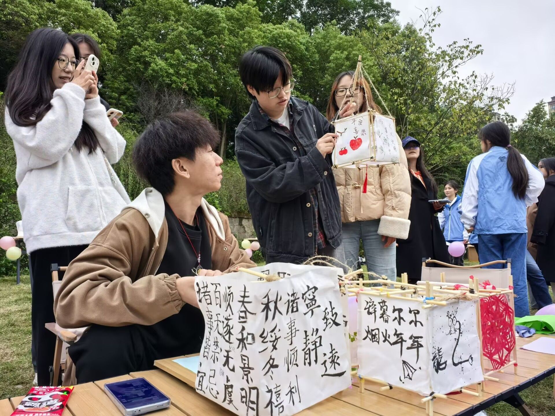 比赛区域,参与人员以七人一组,进行宫灯制作。在教学人员的引导下,从设计到制作,每一步都精心雕琢,大家先将一次性筷子用皮套绑成灯架,再小心翼翼地糊上宣纸,并配以精美的彩绘图案;随着时间流逝,一盏盏造型各异、流光溢彩的宫灯在大家的巧手中逐渐成形,现场欢声笑语。参与同学纷纷表示,在制作过程中,大家相互协作,共同解决问题,不仅增进了友谊,还培养了耐心与细心的能力。这次体验不仅让他们领略到了宫灯制作的繁琐与精美,更深刻体会到了传统文化的深厚底蕴。制作宫灯,让同学们在忙碌的学习生活中找到了片刻宁静,感受到了传统文化的独特韵味。
