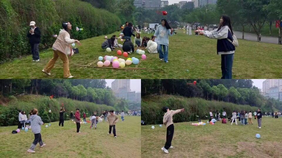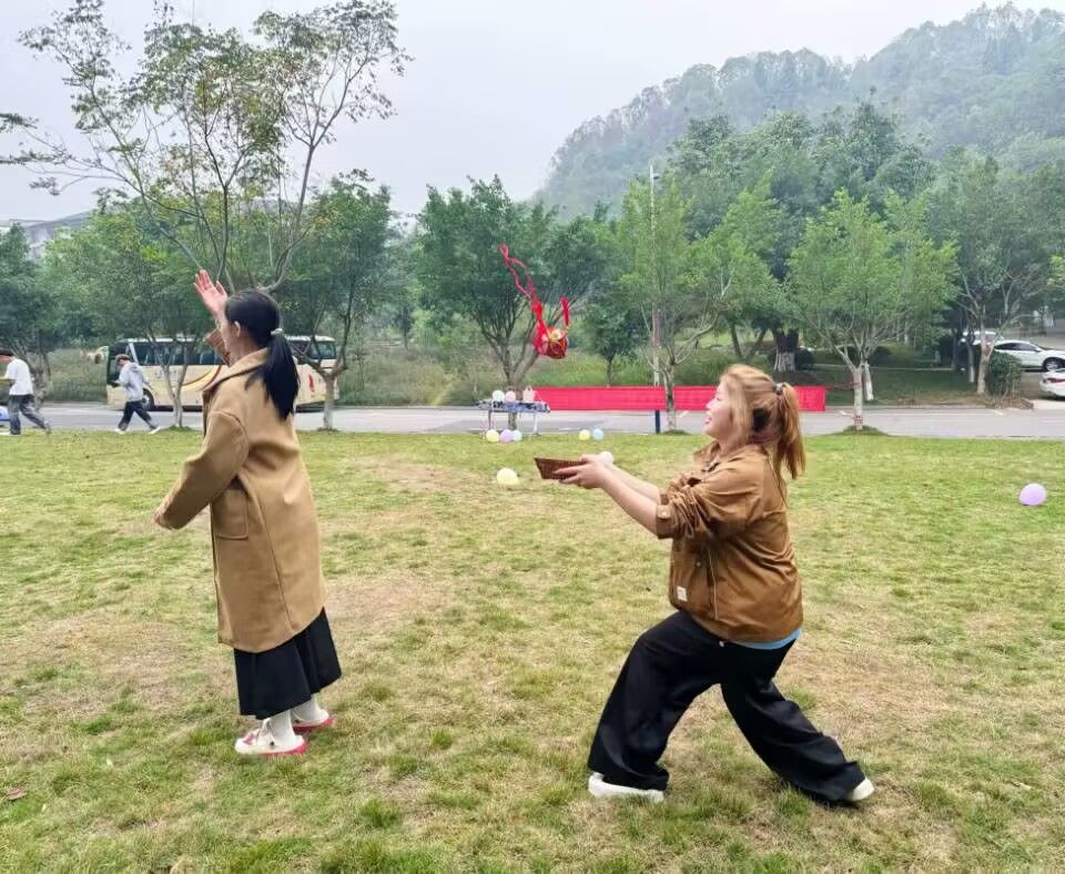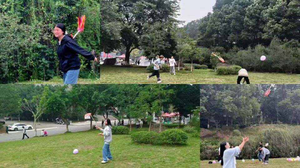 关卡二便是壮族的传统活动——抛绣球,又名“绣球舞”,一人抛投一人使用篮子接球,只需要累计接完四次绣球即可集章。在此次抛绣球的活动中我们可以看见有心有灵犀的搭档,也有毫无默契“百发零中”的同学,在同学们的欢声笑语中,抛绣球活动渐进高潮,绣球在空中轻盈地飞舞,以优美的弧线划过天际,宛如一道道绚丽的彩虹,为这片天空增添了几分生动与活力。接绣球活动不仅可以培养人与人之间的默契,还可以增进朋友之间的感情,让同学们获得满满的情绪价值,而且增进参与者对我国壮族传统活动“抛绣球”的更深一步了解。
