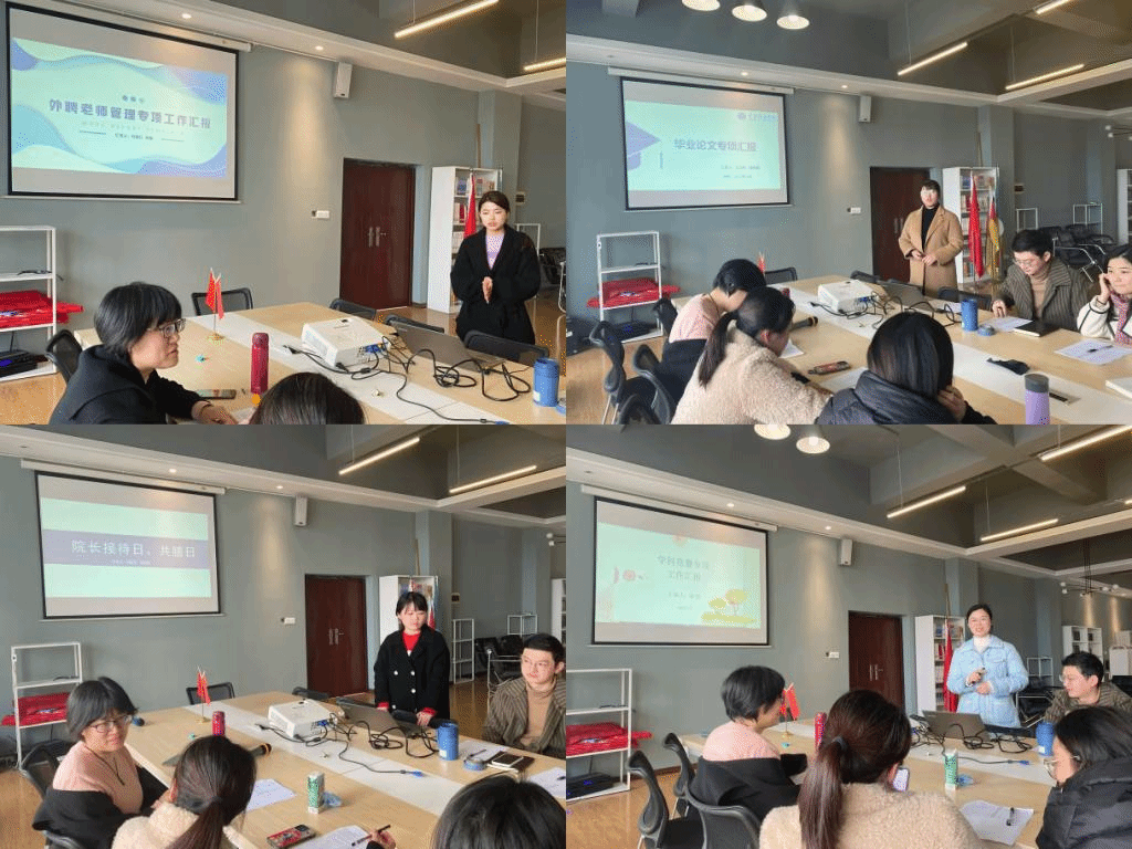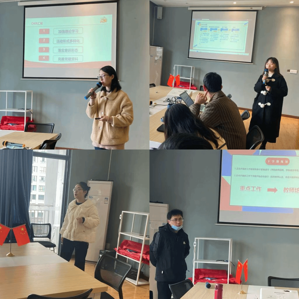 党建管理专项小组唐世静老师首先作了汇报,内容主要有党建工作涉及到的常规事务,特色党建活动等;人力资源管理小组路楠老师对该小组本学期工作内容进行了总结、对工作中的不足进行了反思并提出了相应改进措施;实验室管理专项小组任涛老师对实验室日常管理工作介绍后,提出了管理中遇到的一些瓶颈,并规划了未来的重点工作;外聘教师管理专项小组肖娜老师、学科竞赛管理专项小组陆容老师、品牌营销管理专项小组唐思蓉老师、院长接待日、共膳日专项刘璐瑶老师、校企合作管理专项小组陈郑老师等都在总结上学期工作内容的基础上对本学期的工作作了相应的计划。