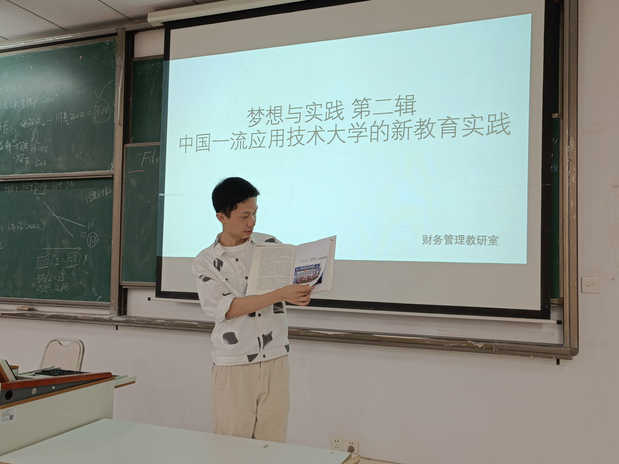 《梦想与实践》第二辑是彭鸿斌董事长近年来关于教育理念与实践的集大成之作,书中系统阐述了中国一流应用技术大学的办学战略、育人模式及教育创新路径。财务管理教研室此次学习活动旨在通过深度研读,将董事长的教育思想与财务管理专业教学相结合,探索更具实践性和前瞻性的教学方法。教研室主任钱万老师在开场时强调:“教育不仅是知识的传递,更是心灵的唤醒。我们需要从书中汲取智慧,将其转化为教学实践的动力。”