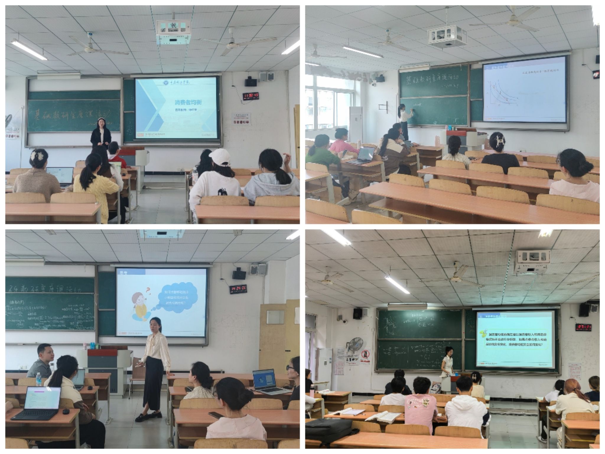 谭红英老师以《宏微观经济学》第三章消费者选择中的“消费者均衡”作为磨课内容,在3月26日与课程团队在5403针对学生学情、磨课内容、教学方法、教学案例、思政内容等进行了集体备课,进一步完善了消费者均衡内容的教学设计;基于集体备课的内容,在4月9日、4月16日谭红英老师与课程团队分别在5505和5105开展了消费者均衡内容的试讲与课堂讲授,课程团队教师针对教学环节、案例与理论的结合、学生的表现等方面提出了宝贵的建议。通过整个磨课过程,谭老师能够结合大学生日常消费案例和图形分析深入浅出地讲解了消费者均衡过程的实现以及消费者均衡条件的推导,并通过校园贷案例引导学生分析校园贷前后消费者均衡时的效用变化,不仅让学生掌握消费者均衡的理论内容及其应用,更加深了学生对理性消费和合理消费的认识。