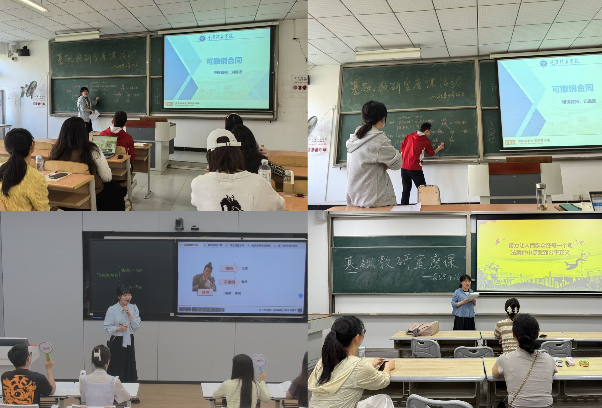 刘璐遥老师以《经济法》第二章民法典——合同编中“撤销还是不撤销”作为磨课内容。3月26日,刘老师与课程组老师分享了本节课的教学目标、重难点、教学思路设计、教学方法以及思政点。此次研讨为如何更好地讲授“撤销还是不撤销”奠定了基础。4月8日与4月16日,刘璐遥老师分别在5204与4105教室开展两次磨课。课程组老师也针对案例如何与知识点融合、理论如何衔接实操、学生的表现等方面提出了建议。在本次磨课中,刘老师将琐碎的民法典法条串成两条线即撤销线与不撤销线,引出撤销权的消灭、证据的收集、违约金的计算、格式合同的特殊规定等知识点。学生们在此过程中不仅习得了法律知识,同时也提高了法律分析能力以及加深了自身对“公平”“严谨”“法律调控”的进一步认知。