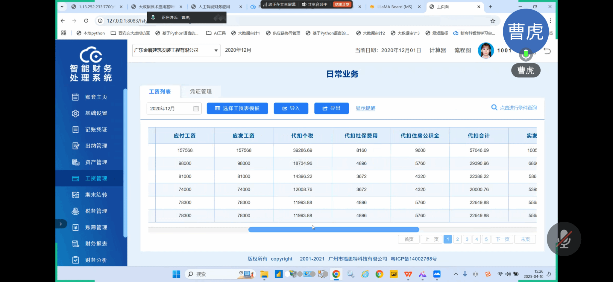 随后,培训进入核心环节,曹虎老师围绕“人工智能应用基础实训平台”“财务大数据实训平台”及“智能财务处理系统”三大数字化财务平台,展开了详尽的讲解与实操演示。在人工智能应用基础实训平台部分,曹老师展示了如何利用人工智能技术优化财务核算流程、提升财务分析效率,让参训教师直观感受到了AI技术在财务管理领域的巨大潜力。财务大数据实训平台的介绍则聚焦于数据驱动的决策支持,曹老师通过模拟企业竞争环境识别、财报状况呈现、销售业务挖掘及采购业务规划等场景,让教师们深刻理解了大数据分析在财务决策中的关键作用。智能财务处理系统的讲解环节,曹老师特别强调了税务管理系统的重要性,详细阐述了其自动化处理流程、风险防控机制及合规性管理要点,为参训教师提供了实用的税务管理工具和方法。
