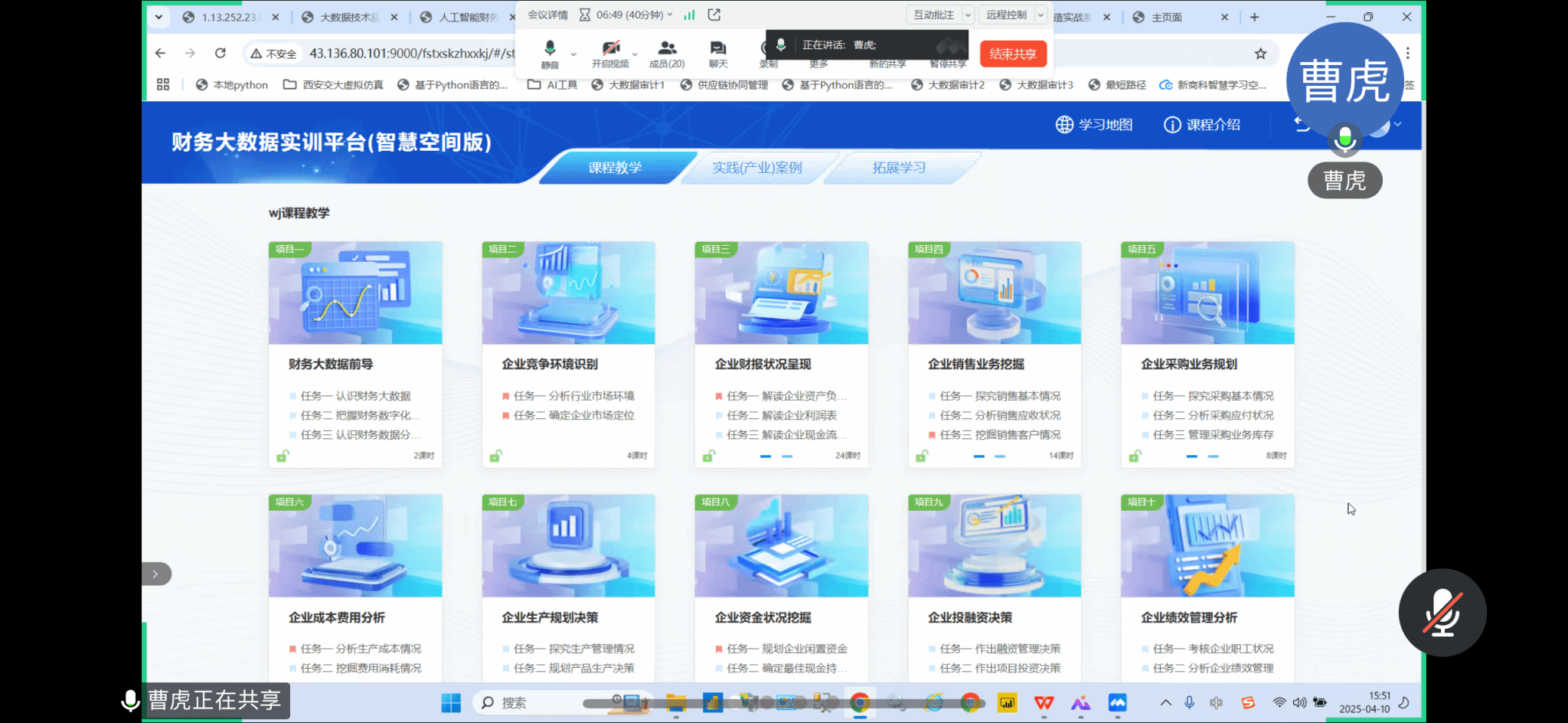 为积极响应数字化转型浪潮,提升教师队伍的数字化教学能力,4月10日下午,淬炼商学院财务管理教研室组织了一场以“数字化财务平台”为主题的线上学习与应用培训活动。本次培训吸引了教研室全体专职教师的积极参与,并特邀广州市福思特科技有限公司资深经理曹虎老师担任主讲嘉宾,为参训教师带来了一场内容丰富、实践指导性强的专业培训。
