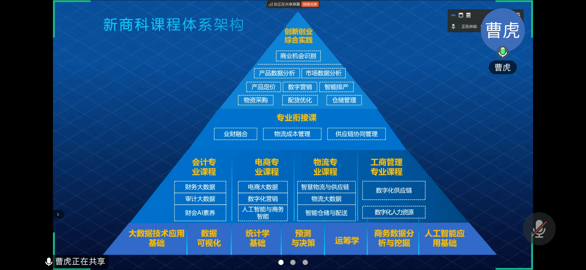 培训伊始,曹虎老师从宏观视角出发,深入浅出地介绍了新商科课程体系架构,强调了课程体系中创新创业综合实践、专业衔接课、会计专业课程以及大数据技术应用基础四大板块的紧密联系与协同作用,为参训教师构建了清晰的学科知识体系框架。