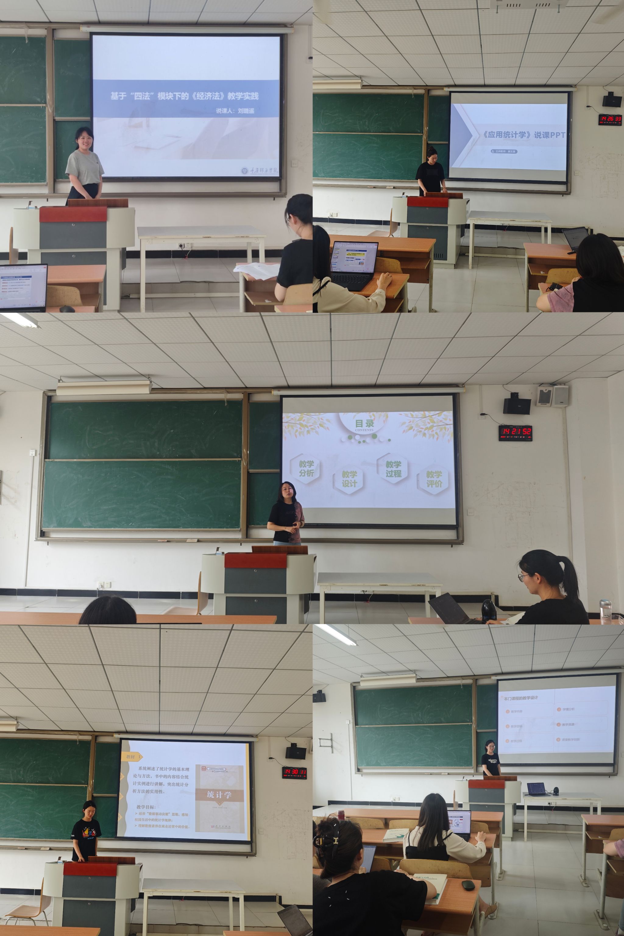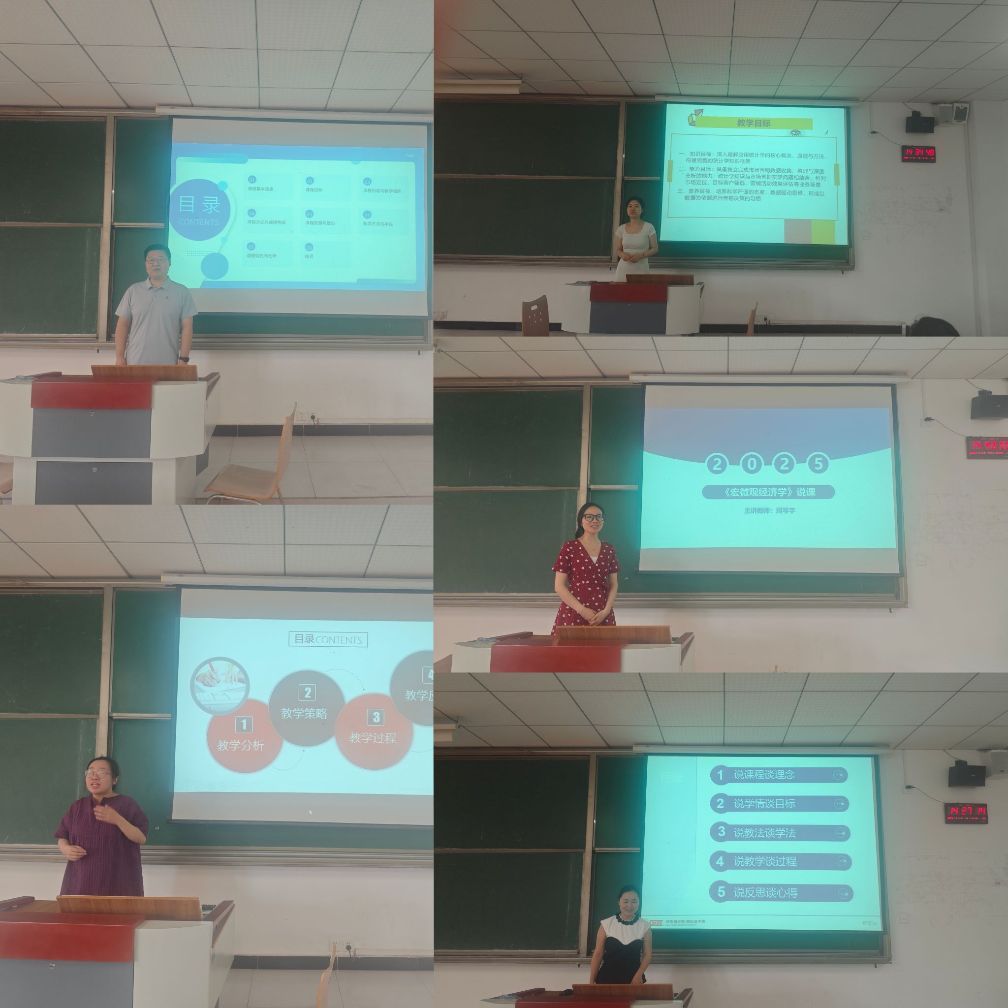 6月11日的活动中,李邓金老师以《新商科案例分析》课程为对象,介绍了课程通过整合多学科案例、组织案例研讨与汇报等形式,提升学生综合分析与解决问题能力的实践路径。贺静老师以《应用统计学》课程展开说课,她基于学生不同的数学基础与专业背景,精准分析学情,针对性地选择适配教材,并以此为依托,明确提出培养学生数据收集、整理、分析与解读能力的教学目标;彭一书老师针对《商业数据分析》,展示了课程在培养学生商业洞察力与数据挖掘能力方面的探索,介绍了将前沿数据分析工具与商业案例结合的教学模式;陈郑老师就《企业模拟经营》课程,讲述了通过虚拟仿真实验、团队协作经营等方式,让学生在实践中掌握企业运营管理知识与技能的教学设计;周琴宇老师围绕《宏微观经济学》,分享了课程中引入行为经济学前沿理论、开展经济模型实践应用的教学创新思路;袁黎黎老师针对《经济法》,提出将法律知识与商业伦理教育融合,培养学生法治思维与职业素养的教学方法。