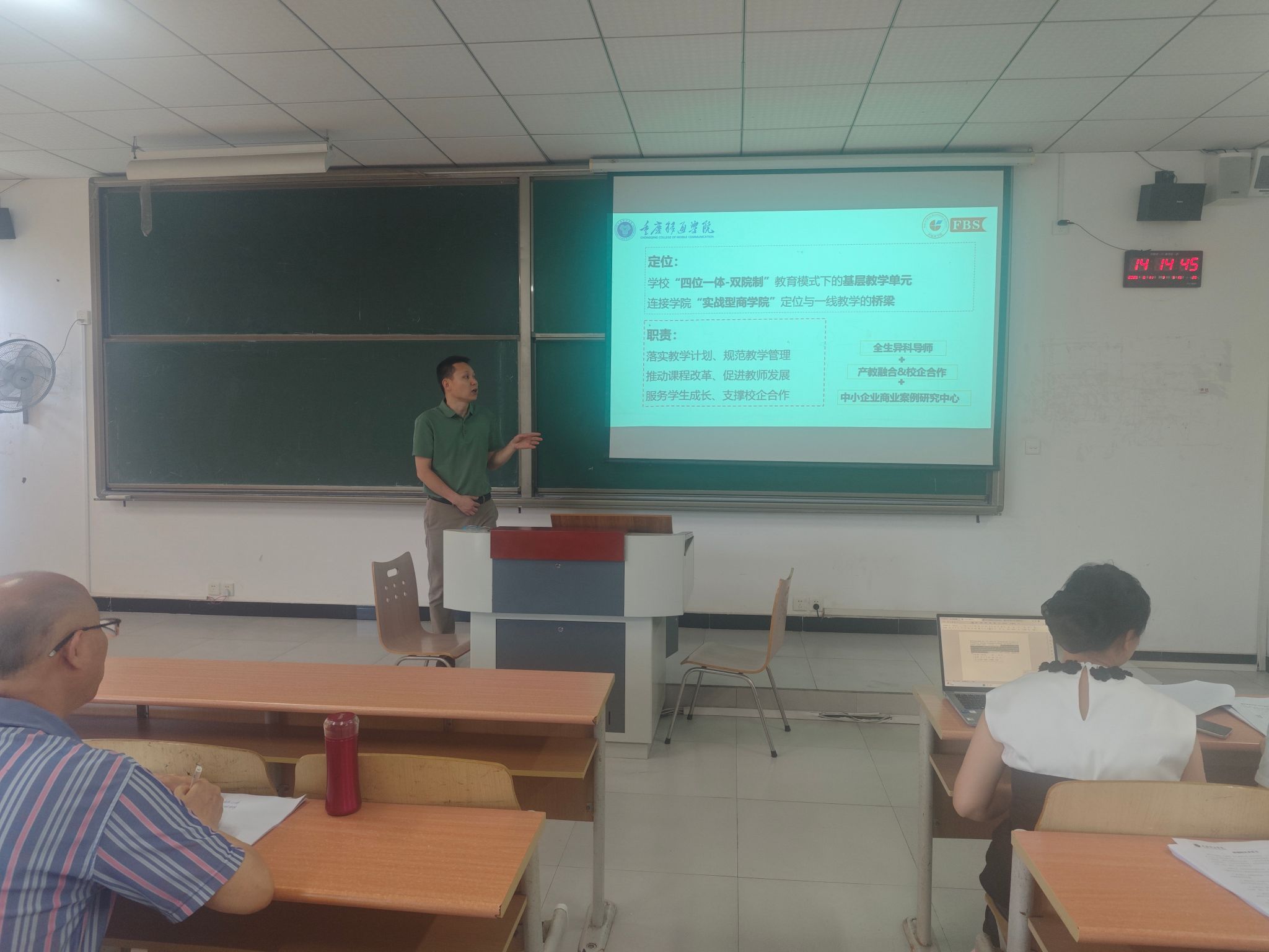6月11日活动中,李邓金主任开展基层教学分享,围绕教研室落实学院教学改革精神、教学团队建设、课程建设和人才培养模式改革等方面进行了全面阐述。在教学改革落实上,李邓金主任介绍了教研室如何将“四位一体双院制”、 “产教融合”“课程思政” 等理念融入日常教学;教学团队建设方面,分享了通过 “老带新”、教学研讨等方式提升教师教学能力的具体举措;课程建设与人才培养模式改革中,详细说明了教研室在优化课程体系、对接行业需求、强化实践教学等方面的规划与进展。此外,还对课堂教学方法与手段的改革创新、课程教材建设、教学项目与成果培育、实践工作开展及教学质量保障体系建构等工作进行了系统说明,为教师们明确了教学发展方向,也为本科教学工作合格评估提供了有力的整体规划支撑。