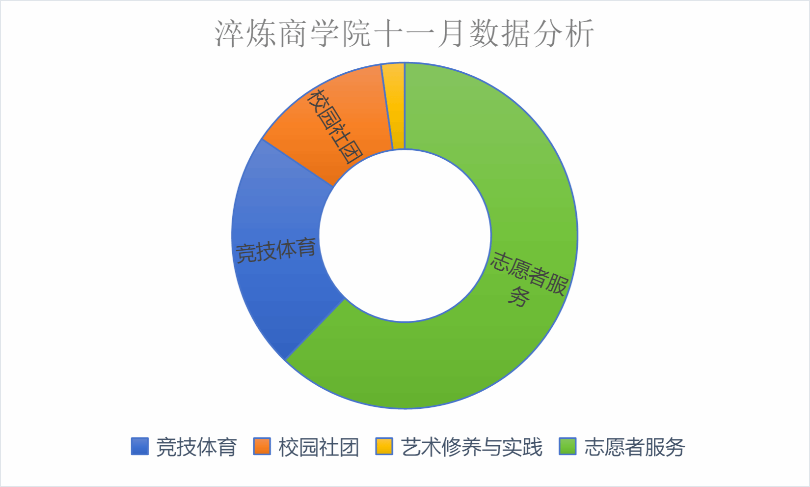 淬炼商学院活动组织单位在十一月里再次发力,共举办了45场特色鲜明的完满教育活动。其中,志愿者服务活动以28场的数量独占鳌头,彰显了我院学生对社会责任和公益事业的热情投入。