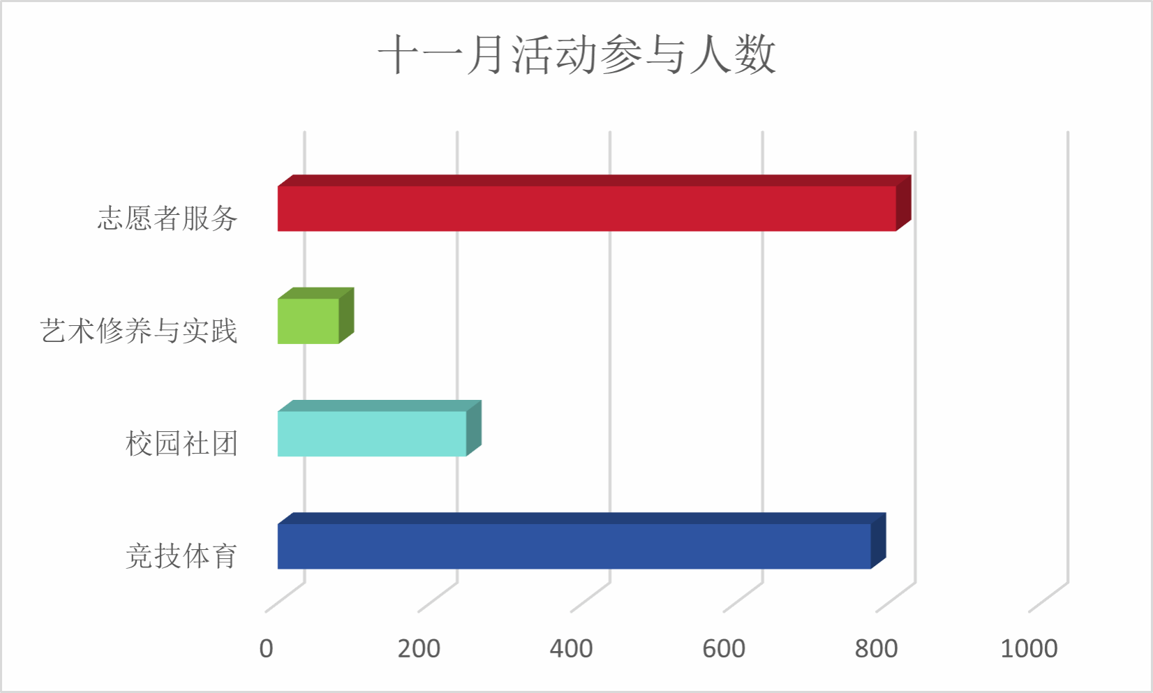 从十一月的活动数据可以看出本月的完满教育活动中,志愿者服务活动所参与的人次最高,为810人;其次是竞技体育活动,为777人。