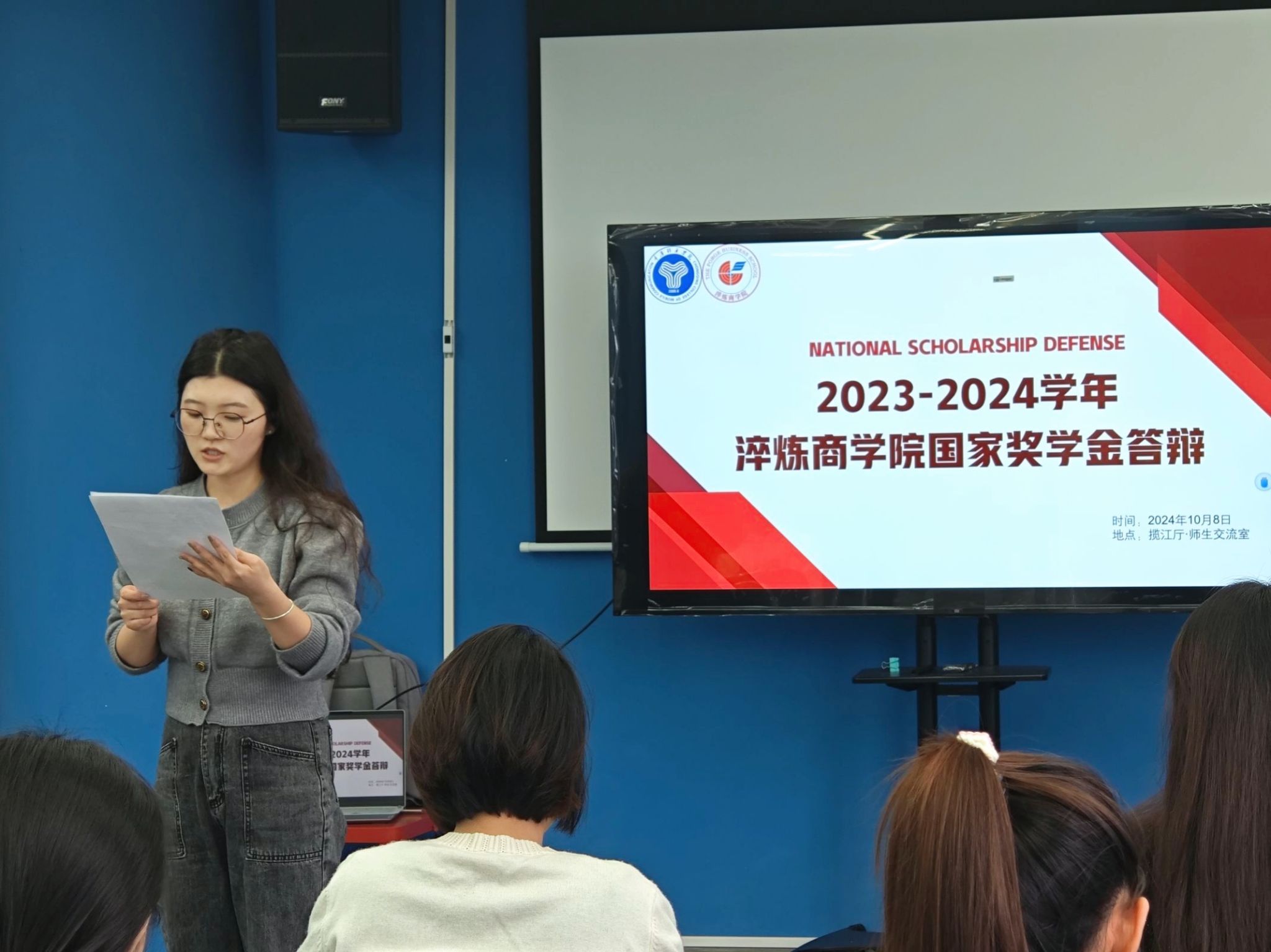 为树立先进典型,充分营造发现榜样、学习榜样、争做榜样的浓厚氛围,切实做好国家奖学金评审工作,淬炼商学院秉持“公开、公平、公正、择优”的评选原则,于2024年10月8日下午14:30在天空书院揽江厅举行了2023-2024学年国家奖学金答辩会,同时有幸邀请到叶洵、张琳莉、邓兴强、陈飞、陈露桦和孙成彬六位老师担任本次国奖答辩的评委,让学子们展现出自己过往的优秀风采,引导学生们积极向上。