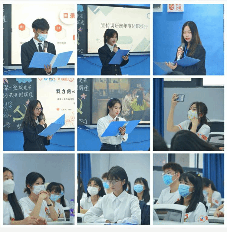 各部门代表依次述职,围绕本学年工作进行总结概述,对工作中取得的成绩进行梳理,面临的问题进行剖析,分享在为期一年的学生工作中的收获与成长,对以后的工作做出思考和规划。淬炼·国际商学院(綦江校区)学生组织的九大部门在指导老师的带领下,打破双校区限制的零基础,踏实做好工作,在学生组织的道路上越走越远。綦江淬炼开展的活动和工作切合实际要求,不断靠拢学生意愿,牢牢把握可行性与创新性,使得其参与面大、受众群体多、教育意义深,这都离不开各位老师的悉心指导、学长学姐的耐心帮助和干事们的辛勤付出。