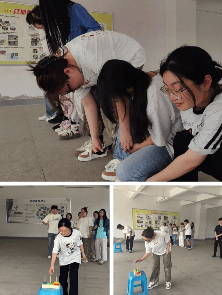 第二环节由两个汉诺塔展开,汉诺塔作为一款经典的益智游戏,考验着团队的策略规划与协作执行能力。在教官简单介绍过游戏规则后,两小组迅速进入思考状态,围成石榴一般在一起讨论策划。有人用树枝在地上比划着步骤,有人运用数学的专业知识,有人则不断观察并考量前行方案。本次比赛,双方兵刃不让,各自凭借智勇进行前期周密的规划,开局便稳扎稳打,小组内成员互相鼓励,互相出谋划策,使得游戏过程非常愉悦轻松。汉诺塔游戏对于大部分成员都较为陌生,初次接触,但在紧张的比赛过程中却无人泄气。小组形成移动链,以流水线作业缩短耗时。过程中虽然出现失误的情况。但依旧秉持着“千磨万击还坚劲,任尔东西南北风”的精神,反复攻克难题。在25分钟的激烈角逐后,终以“奔跑队”率先完成汉诺塔堆建而结束了这场比赛,铁锤队虽落后几秒钟,但对于他们而言比赛中收获到的快乐已远远超过获得比赛输赢的重要性。