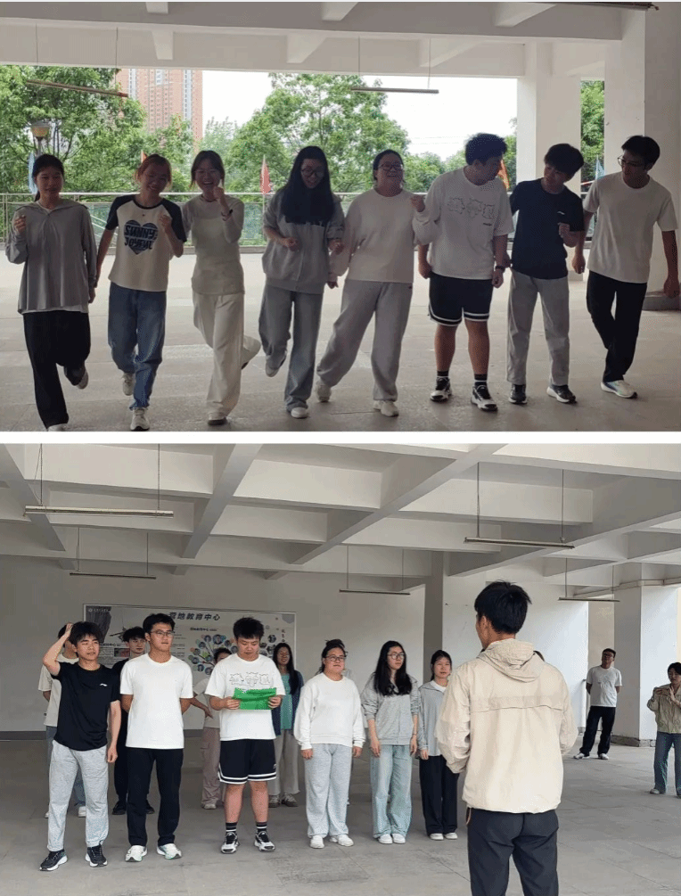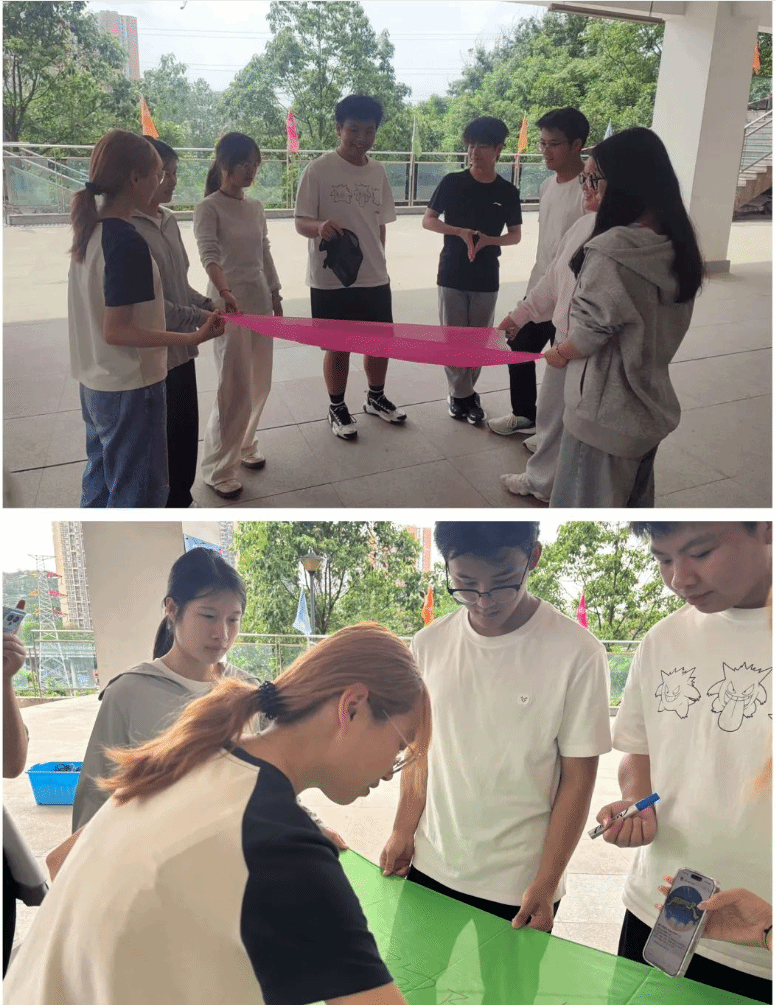 活动伊始,青马学员们以抽签分为两组。一声令下,两队即刻进入“战备状态”,队名设计、队旗绘制、队歌创作环环相扣,一场关于“凝聚力”的破冰之旅在欢笑与掌声中悄然拉开帷幕。第一小组取“奔跑”为名,寓青年当以“风驰电掣”之姿逐梦时代,以“不待扬鞭自奋蹄”之志攀登高峰。小组成员齐心绘制绿色为底,尽显小组成员追风逐电,志在凌霄的气迈。队长解读本组队旗与队名的含义为:“赛道是人生路,星芒是理想光,我们愿做追光者,亦做发光体。”奔跑队学员齐唱《奔跑》:“追逐雷和闪电的力量”……。第二组则化用“宝剑锋从磨砺出”,喻青年当以“铁肩担道义”之责,在时代熔炉中锻造“越是艰险越向前”的骨气。队旗以黄色为基,在旗帜上绘制一颗茁壮的青树,在每一根茎叶处签署上成员的姓名,不仅彰显了成员间的相互信任,更是显化了第二组肯千锤百炼,淬火成锋的决心。一曲《倔强》响彻全场,当“逆风的方向更适合飞翔”唱至高潮,队员们激情高歌,士气昂扬,使得观者无不热血沸腾。