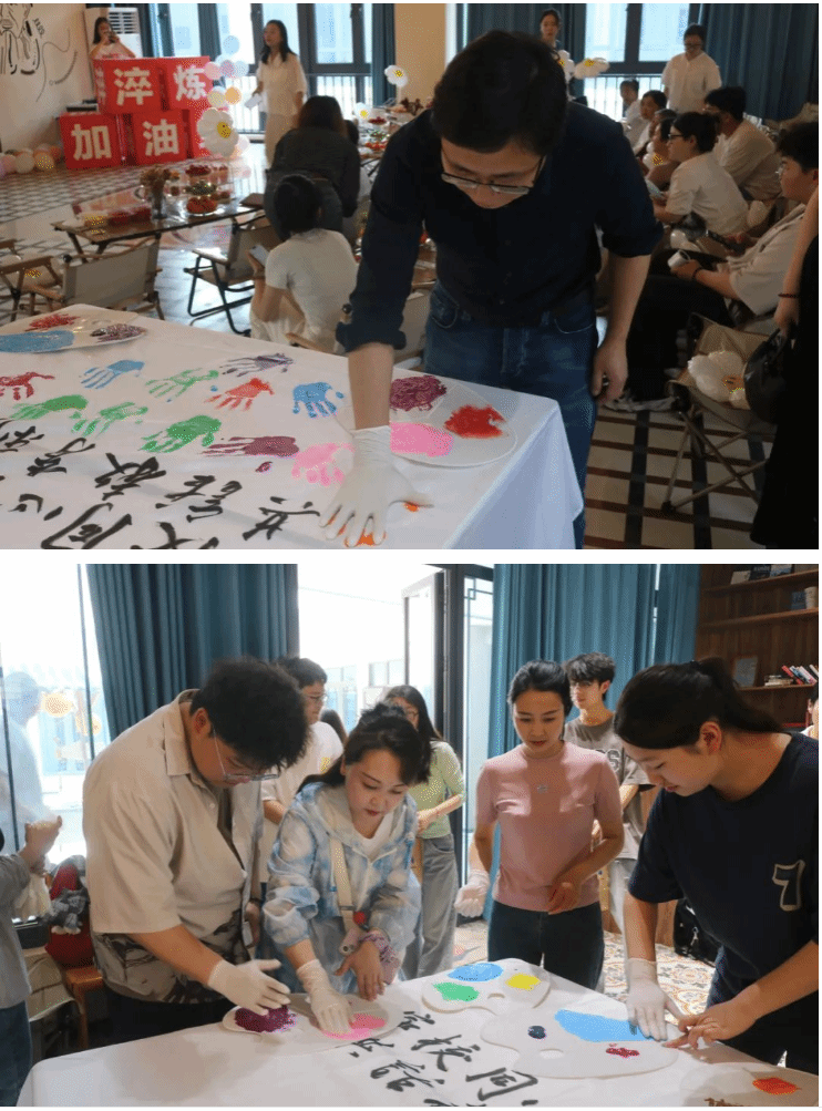 在工作人员的引导下,家长、领导、老师和学生在家校联动锦旗上印上自己专属的手掌印。掌心与掌心相依相连,就像家校之间紧密的羁绊,众人齐心协力,共同绘制出一片充满希望与爱的崭新天地。