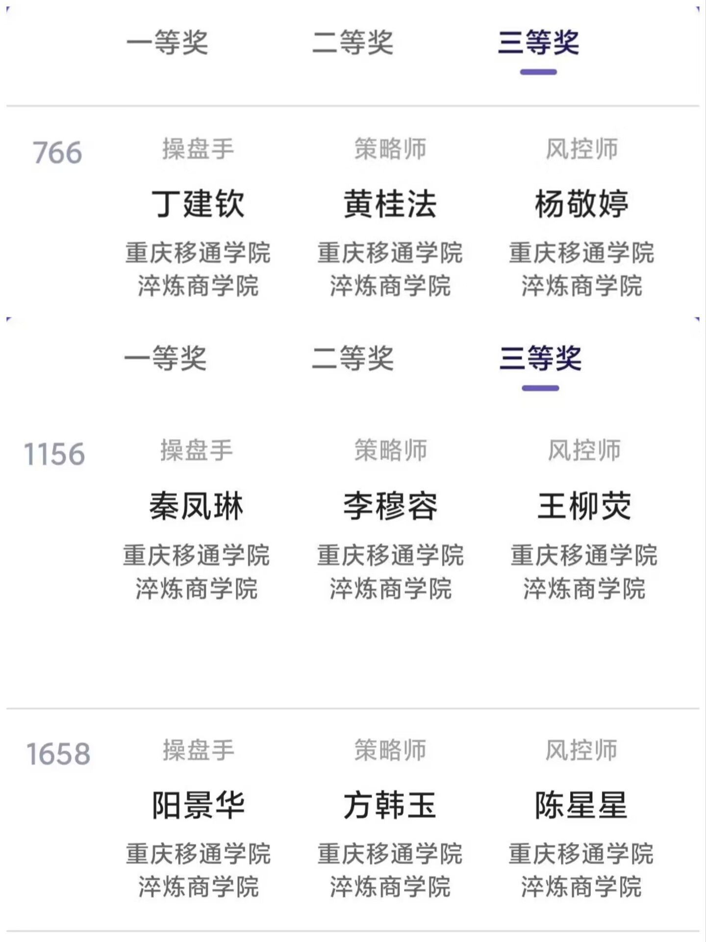 在这场龙争虎斗中,每一位参赛者都用自己的方式诠释了金融的魅力与力量。他们或冷静分析、或果断决策、或团队协作,各显神通。在一次又一次的逐梦登峰、拼搏进阶中,我校共计5支队伍在国赛中崭露头角。其中“薛717y队”荣获一等奖,“saysaysay队”荣获二等奖,“哈哈哈哈哈哦哦队”、“等星辰队”和“信兮游刃队”这三支队伍荣获三等奖。移通学子们共同创造了一个又一个令人瞩目的成绩。在激烈的比拼与筛选中,这些杰出的“金融精英”脱颖而出,这是属于他们自己的荣耀,更是助力学子们以赛促学、赛教融合,让他们把青春播撒在建设国家现代化的征途上,共同开辟成就梦想、成才报国的美好未来。