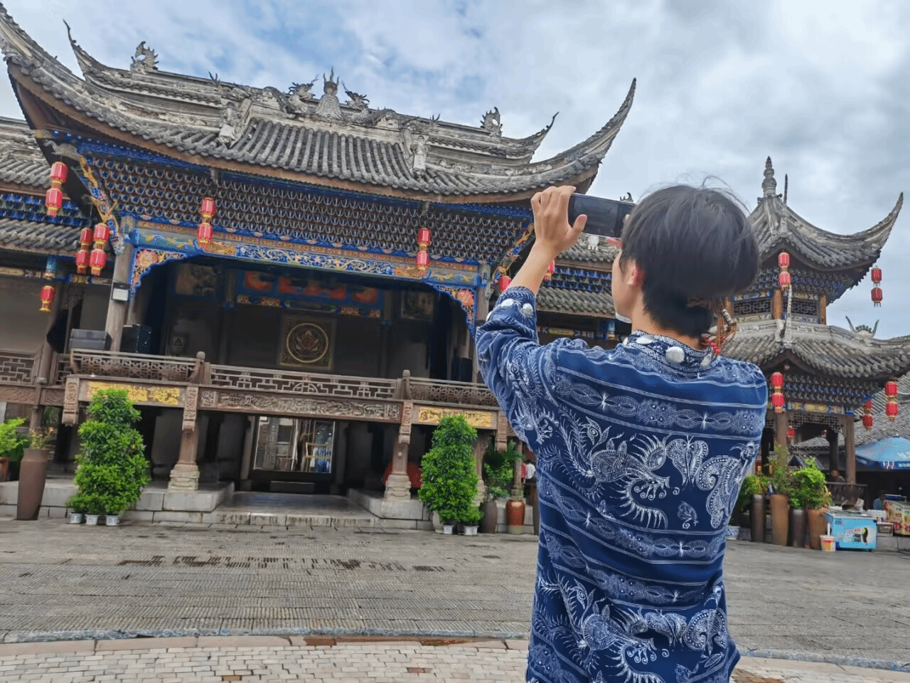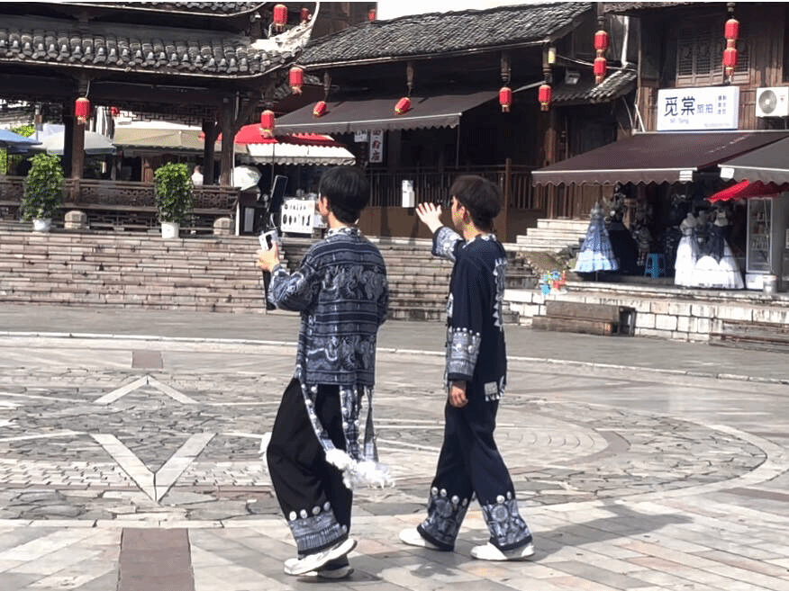 实践团成员们身着苗族盛装开启“行走式直播”,化身古镇文化的“移动窗口”。从祈福长廊飘动的红绸,到古街商铺蒸腾的烟火,聚焦于苗族服饰的银饰工艺,实践团成员们讲述古镇码头昔日的商贸繁华,将建筑与山水的融合之美、民俗与生活的交织温度娓娓道来,让古镇文化借数字平台“破圈”传播,既满足游客云端游览需求,也在互动中深化对民族文化传播的理解,让古老下司的魅力跨越山海,走向更广阔的天地。