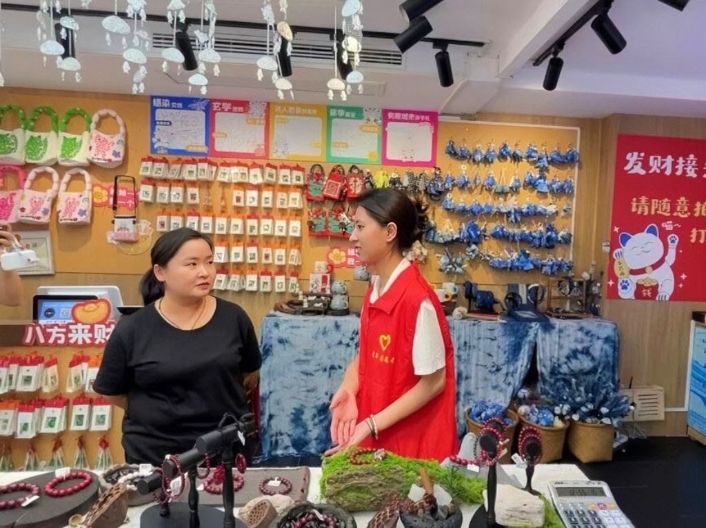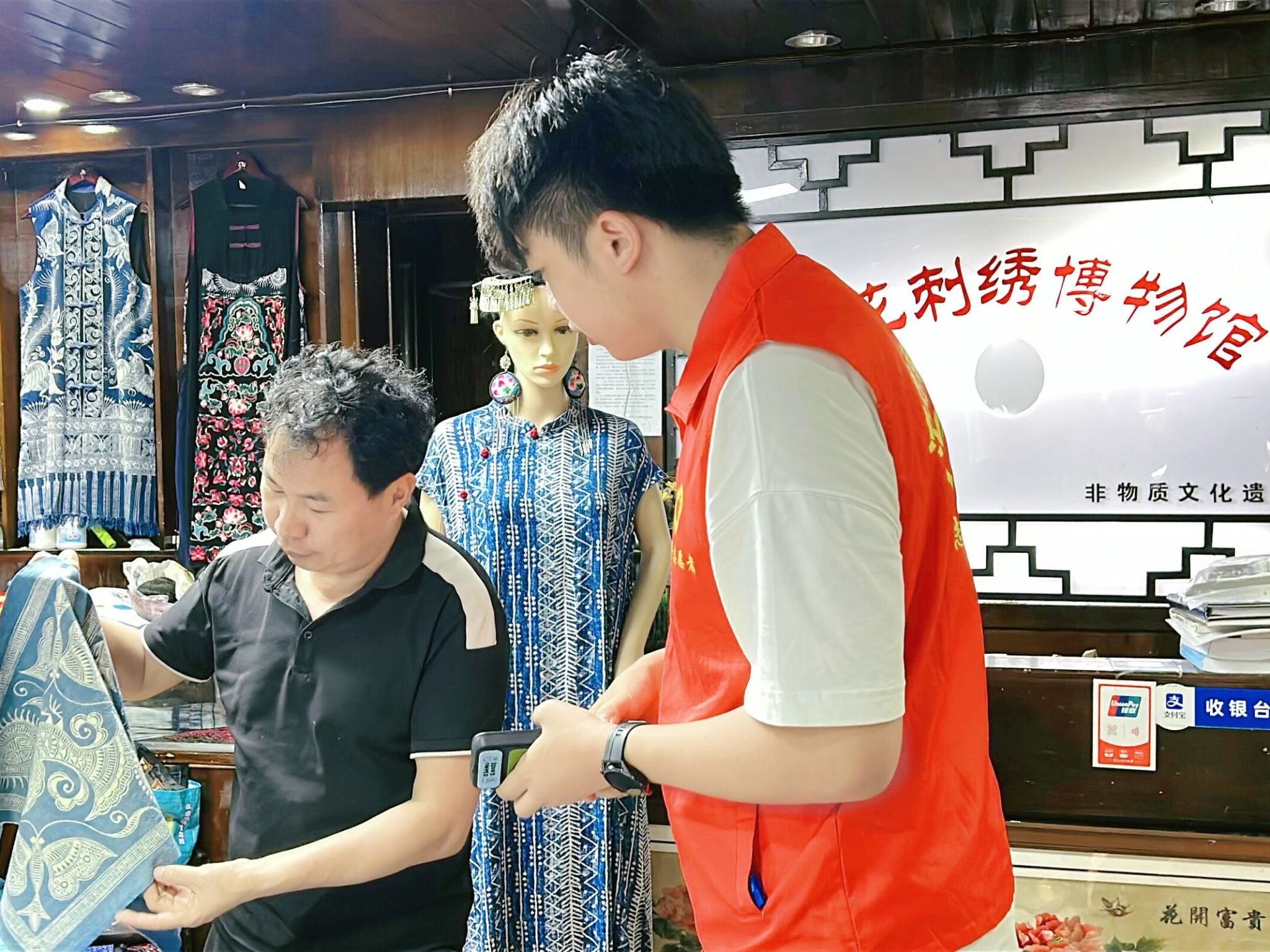 走进苗寨文创馆,实践团成员们与设计师深入交流苗族银饰、蜡染纹样的现代转化逻辑。在琳琅满目的文创产品中,成员们聚焦“苗绣元素×潮流设计”“银饰工艺×实用器物”等创新案例,不仅采购承载文化记忆的手作好物,更以短视频拍摄、直播讲解等形式,向外界传播“传统纹样如何通过设计赋能走进现代生活” 的文化创新理念。
