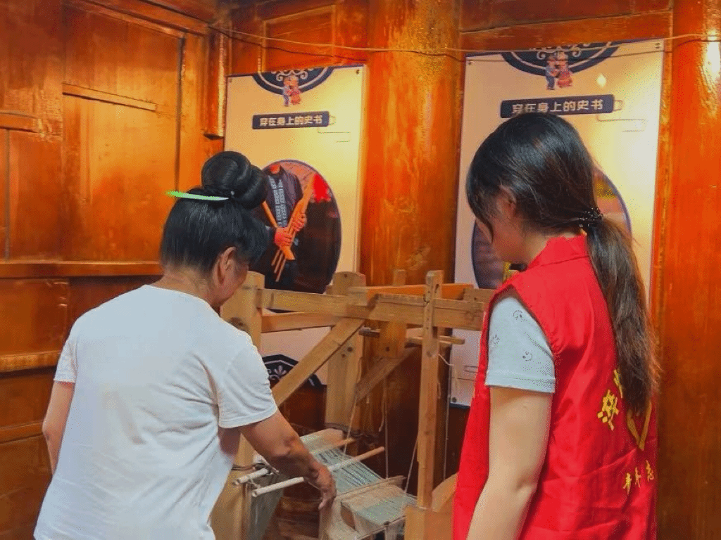 苗绣是苗族传承千年的刺绣技艺,以五彩丝线、独特针法绣制苗族图腾与生活图景,兼具实用价值与文化传承意义的非遗工艺。在青曼苗寨,实践团成员们特地拜访了凯里市名绣娘潘英-潘奶奶。她的一生都奉献给了苗绣,不仅精于创作,更热心传承,走进校园、开办培训班,让苗族刺绣技艺在新一代心中绽放光彩,但现实却面临诸多问题。潘奶奶感慨到,“年轻人难沉下心,技艺传承遇冷。”但她仍满怀期待,“盼借多元平台,让苗绣走进生活,吸引年轻人接力”。这份坚守与期盼,正为苗绣文化跨越代际、走向未来点亮明灯。