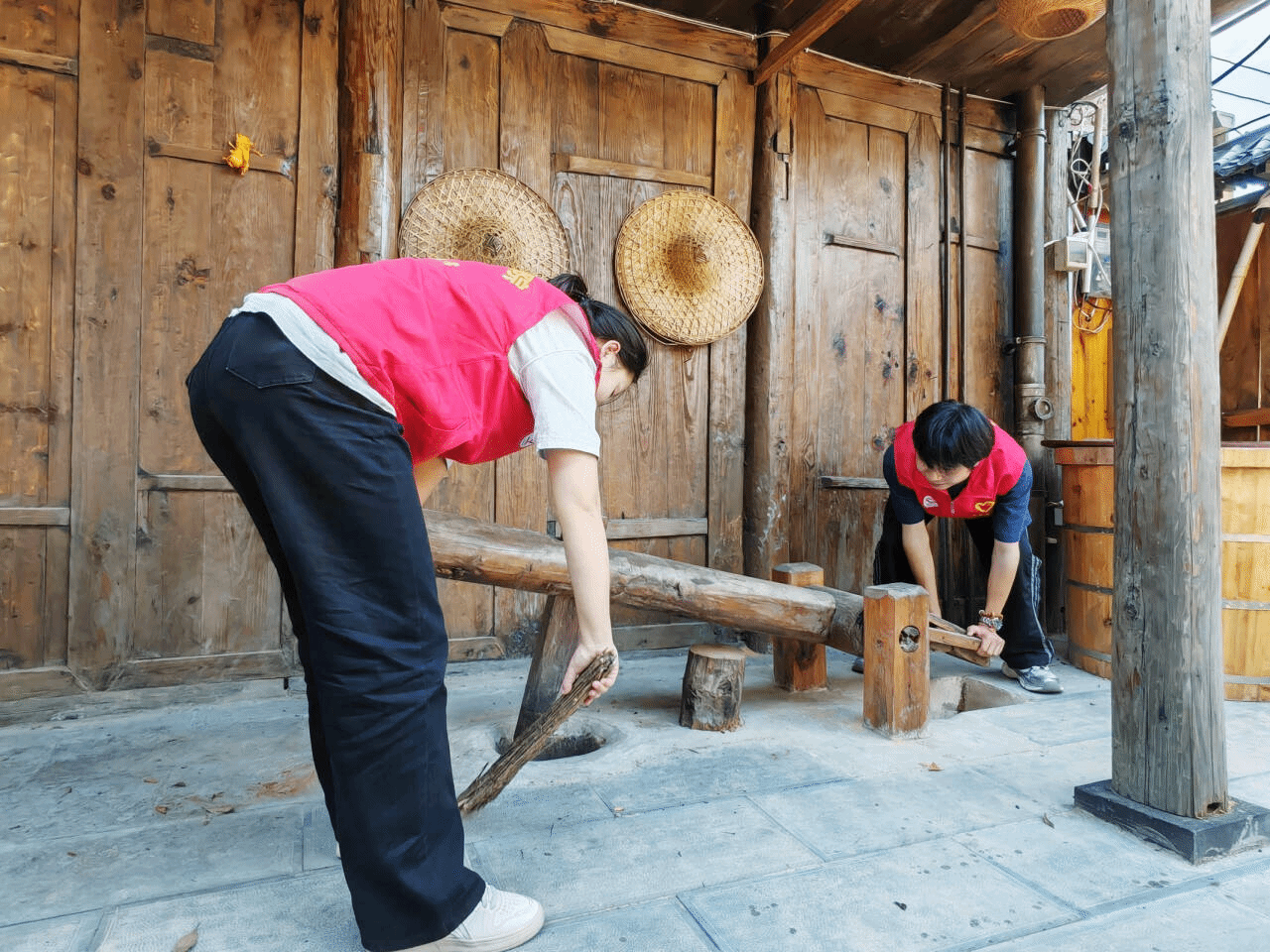 实践团成员们身穿红色志愿马甲,深入探访苗药人家,开启“体验式研学”,成为苗药文化的“青春传播者”。实践团成员们从文化展板上的苗药知识,到传统作坊里的制作工具,聚焦苗药炮制的古老技艺,成员们操作木质器械,讲述苗药传承故事,把药草特性、制作流程细细呈现。让苗药文化在实践体验“鲜活”传承,既能满足对传统医药的探索欲,也能在实操中加深对民族医药的理解,助力苗药智慧走向大众视野。