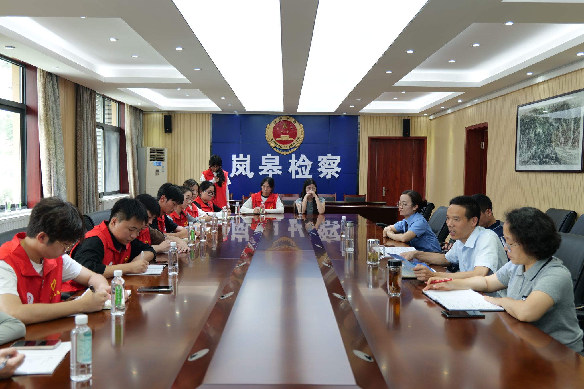 紧接着,宣讲团一行移步至会议室,与检察院代表展开深度座谈会。会前,宣讲团成员观看了《十八岁的天空》微电影。这部作品以生动的故事展现了检察院的真实典型案例和在青少年法治教育中的重要作用。在交谈环节,宣讲团成员针对检察院在未成年普法教育中所开展的工作,以及创新普法形式等方面进行提问。随后,检察官们对宣讲团成员的问题进行了深刻而又全面的回答。宣讲团成员纷纷表示,此次交流,不仅学习到了法治中国的岚皋实践,进一步拓宽了工作思路,也增强了宣讲团的理论知识水平。