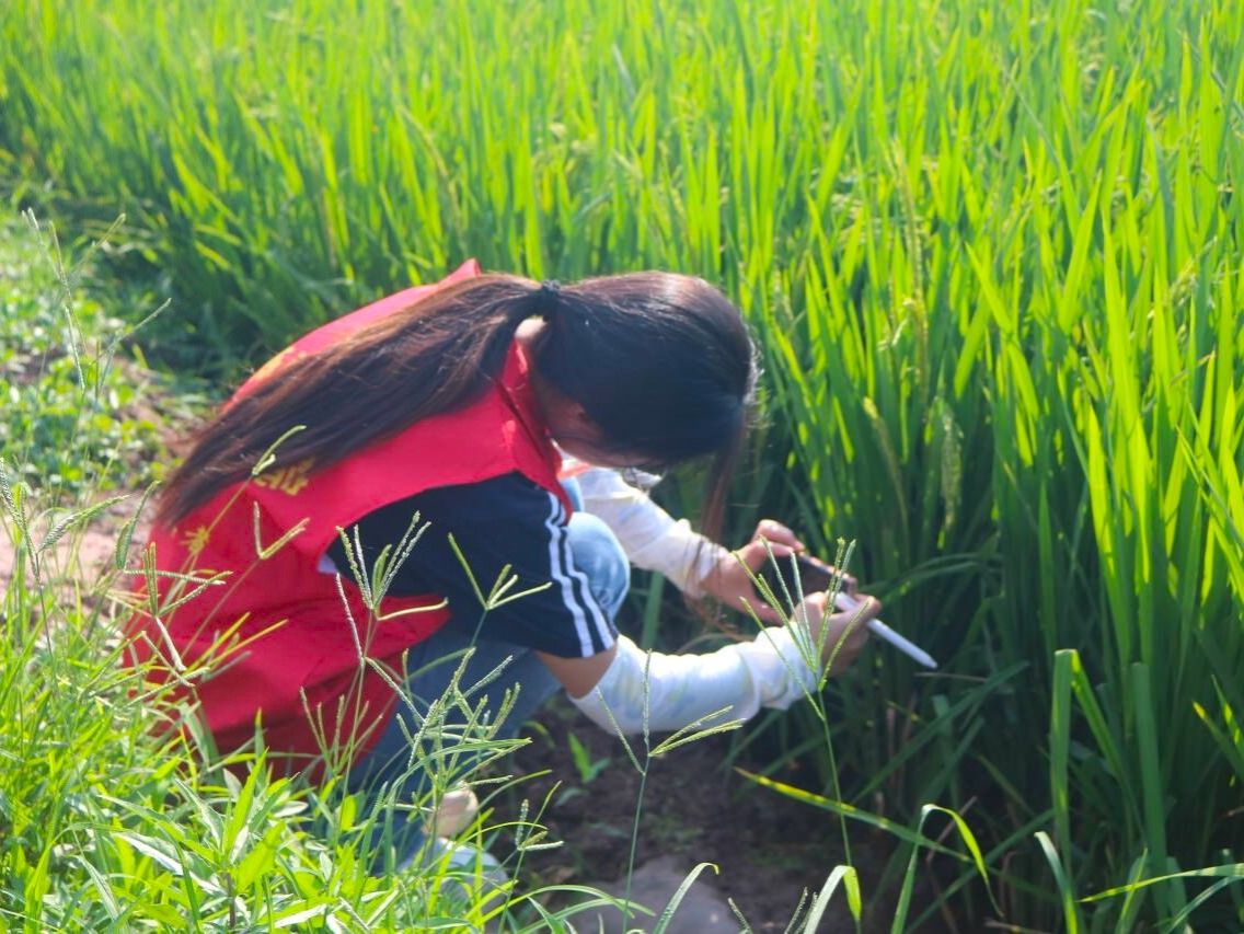 盛夏的阳光洒满重庆市合川区三庙镇的田野,稻浪翻滚间,身着红马甲的青年志愿者挽起裤脚、踏入水田,用双手触摸泥土的温度,用镜头捕捉稻禾的生长轨迹。