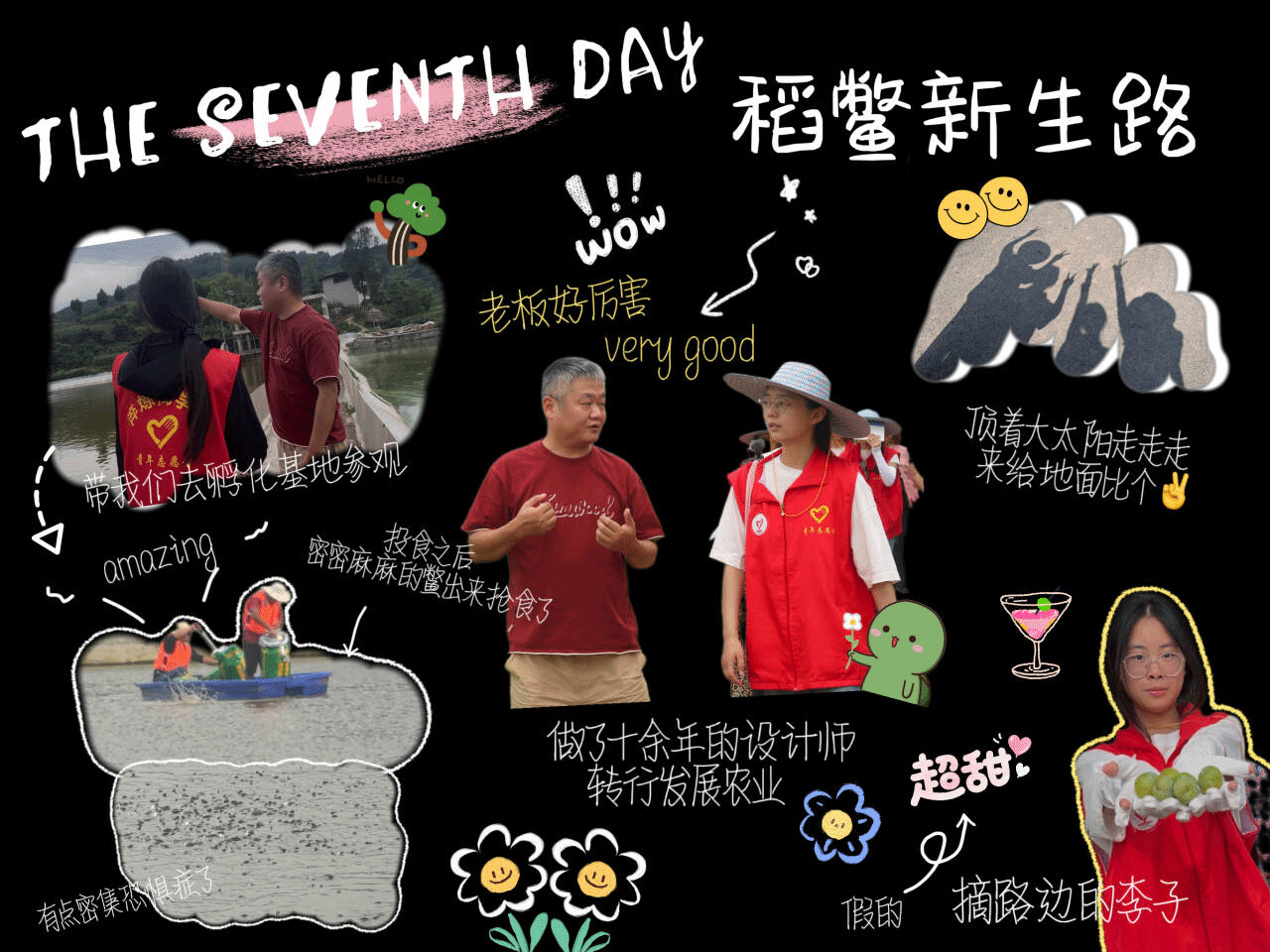 在聚焦产业发展的同时,促进团心系乡村未来,特别为当地留守儿童开设多元课程。成员们分组精准辅导22名孩子,创新采用黏土、不织布创作等趣味形式取代传统歌舞,有效激发孩子们的童趣与想象力。促进团成员还化身“普法小老师”,通过“传声筒”等互动游戏生动揭示谣言危害,切实提升儿童自我保护意识和能力。为了留存乡村记忆与敬意,促进团倾力创作纪录片《一粒米的故事》:运用无人机航拍展现稻鳖田壮观的生态棋盘格局,用特写镜头捕捉露珠稻叶与巡游甲鱼的灵动瞬间;跟拍古稀夫妇的辛勤农耕场景,镜头深情定格“皱纹笑意与沾泥双手”,以此致敬代代相传的农人匠心。