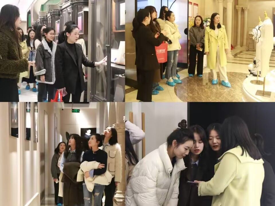 金夫人作为知名企业,在企业管理、市场营销、企业文化等方面都有着丰富的经验。跟随张庆老师的步伐,大家参观了幸福影像馆、全明星定制馆和传承馆;深入摄影工作室、后期制作部门、礼服展示区等关键区域,张庆老师为大家深入讲解各部门工作流程、技术应用以及与母校专业的紧密结合点,校友们认真聆听,不时提出自己的问题和见解,对于部分从事相关行业的校友来说,这是一次难得的学习和交流的机会,同时,这次参观也为校友和企业之间的潜在合作提供了可能,为双方在人才招聘、项目合作等方面搭建了沟通的桥梁。