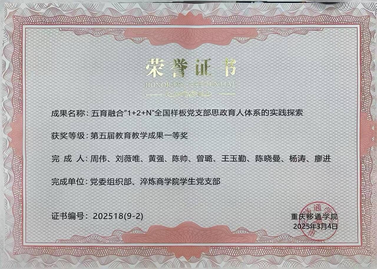 本成果提出“五育融合”背景下,推动“七维矩阵”的提档升级。淬炼商学院学生党支部完成了“五育”(徳育、智育、体育、美育、劳育)融合,让学生主动创造,全面发展;“七维”(政治功能教育、高质发展管理、严明纪律监督、内涵发展组织、传达精神宣传、价值引领凝聚、内外融合服务)矩阵的迭代升级,形成了“1+2+N”(以1个特色模式为主线;2 个“+”,党建+、+党建,深度融合;实施N种培育)的全国样板党支部思政育人体系设计与运用,构建多维度、多环节、多学科交叉、多部门联动、全景融合教学的红色思政育人新格局,经过3年的探索与实践,取得了良好的创新成效,凝练的建设经验和培育成果被重庆市教委及教育部办公厅采纳,入选重庆市首批和全国第三批高校党建“双创”工作样板支部,并顺利通过重庆市和全国样板支部验收,形成可复制、可推广、具有辐射示范的育人模式。