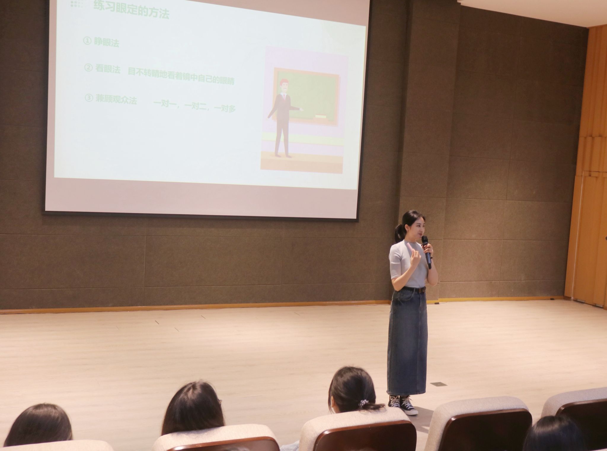 眼定体现对他人的尊重,也是有效沟通的关键。邓巧老师强调在当众讲话时,稳定且真诚的眼神交流至关重要。为帮助同学们切实掌握这一技能,邓巧老师精心设计了眼神针对性训练。经过反复练习,同学们逐渐领悟到眼神运用的窍门,学会在不同场合,用眼神与听众建立紧密联系,为进入职场提前做好充分准备。