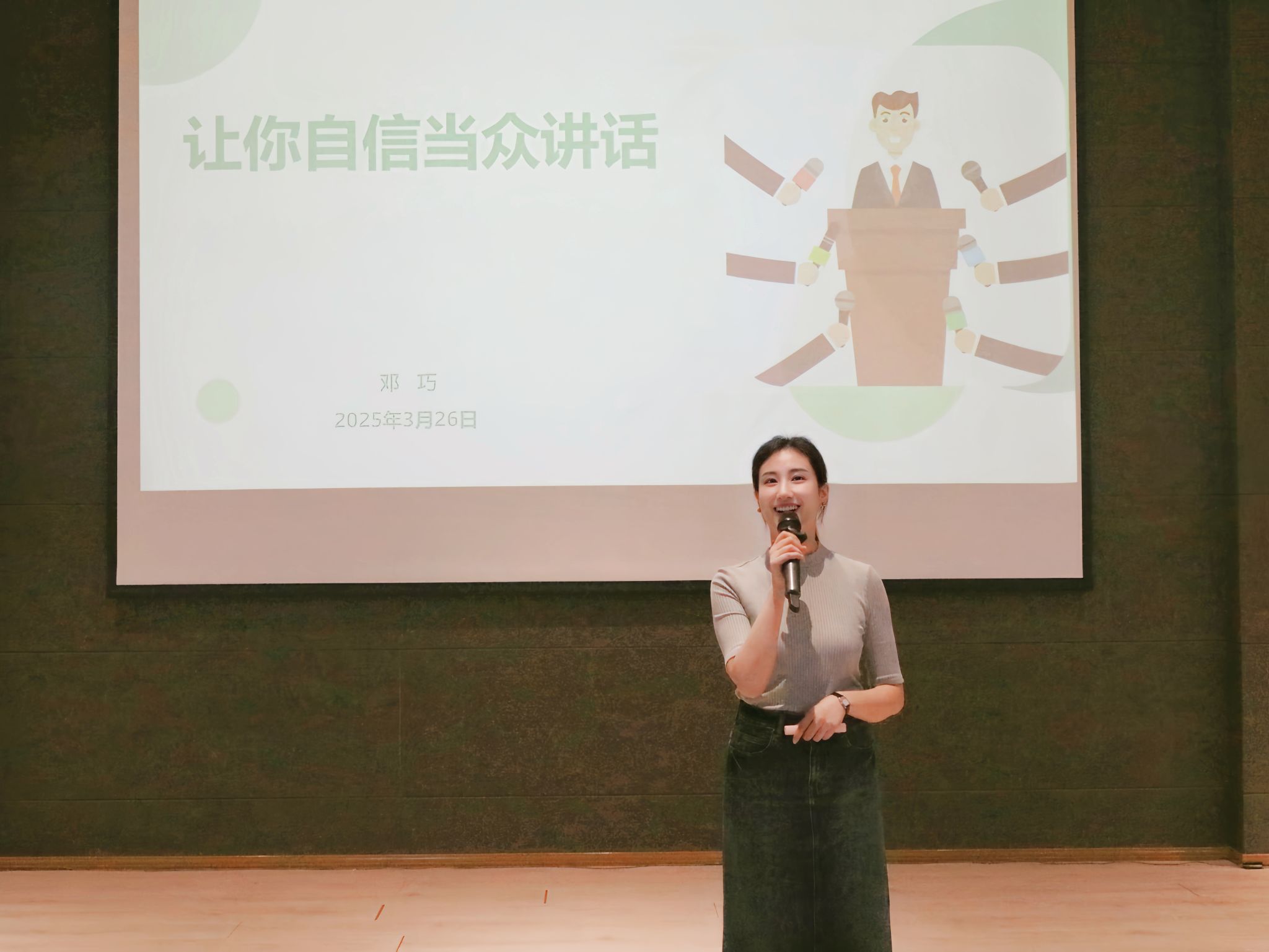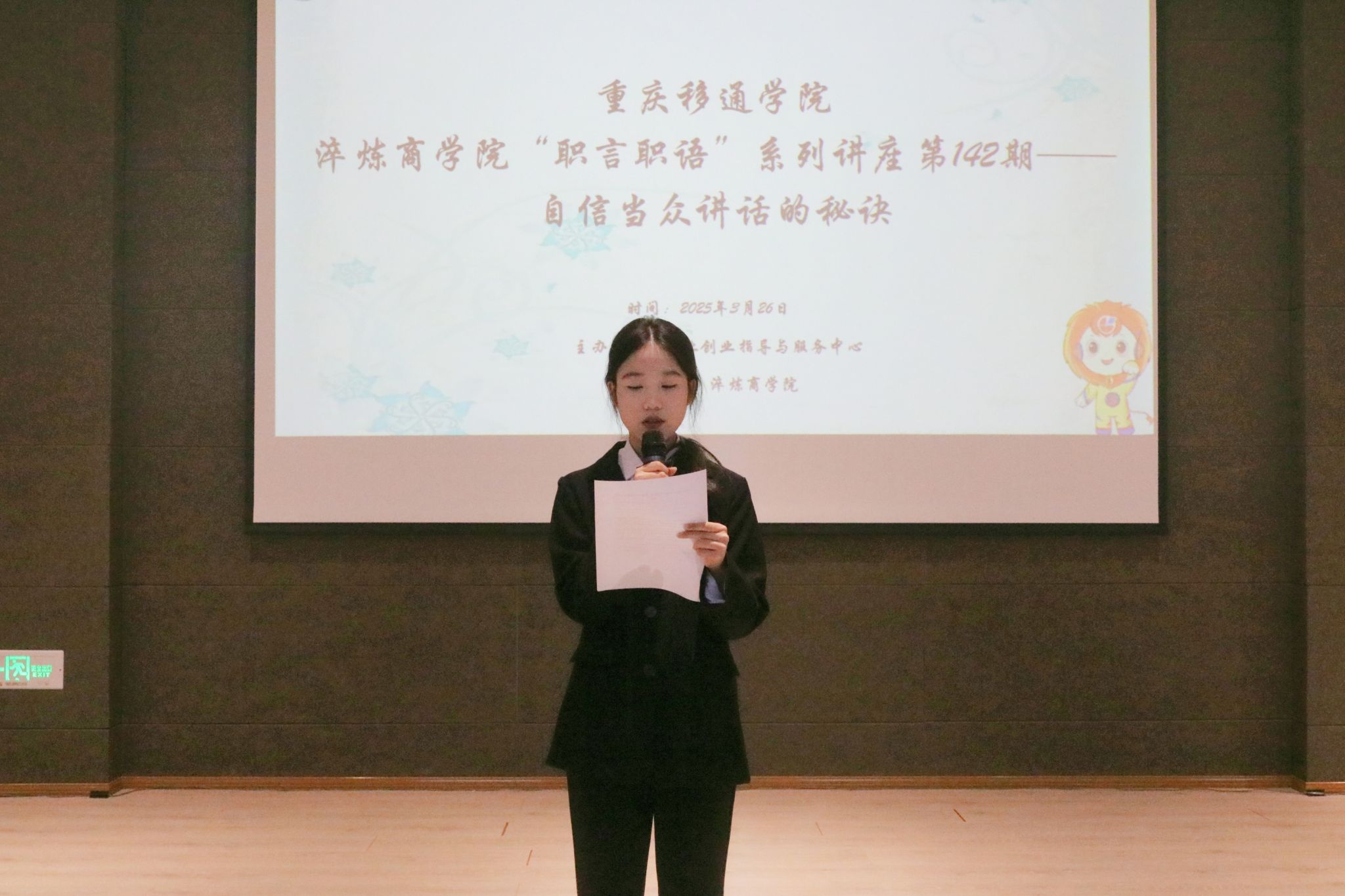 为帮助同学们克服当众讲话的恐惧,自信展现个人风采。由就业创业指导与服务中心主办,淬炼商学院承办的“淬炼商学院第142期‘职言职语’讲座——自信当众讲话的秘诀”于2025年3月26日16:00在六度空间∞多功能厅成功举办。本次活动有幸邀请到就业创业库导师、高级礼仪培训师邓巧担任主讲人,为渴望提升表达能力的同学们呈上一场直击表达痛点,助力蜕变的经验分享会。