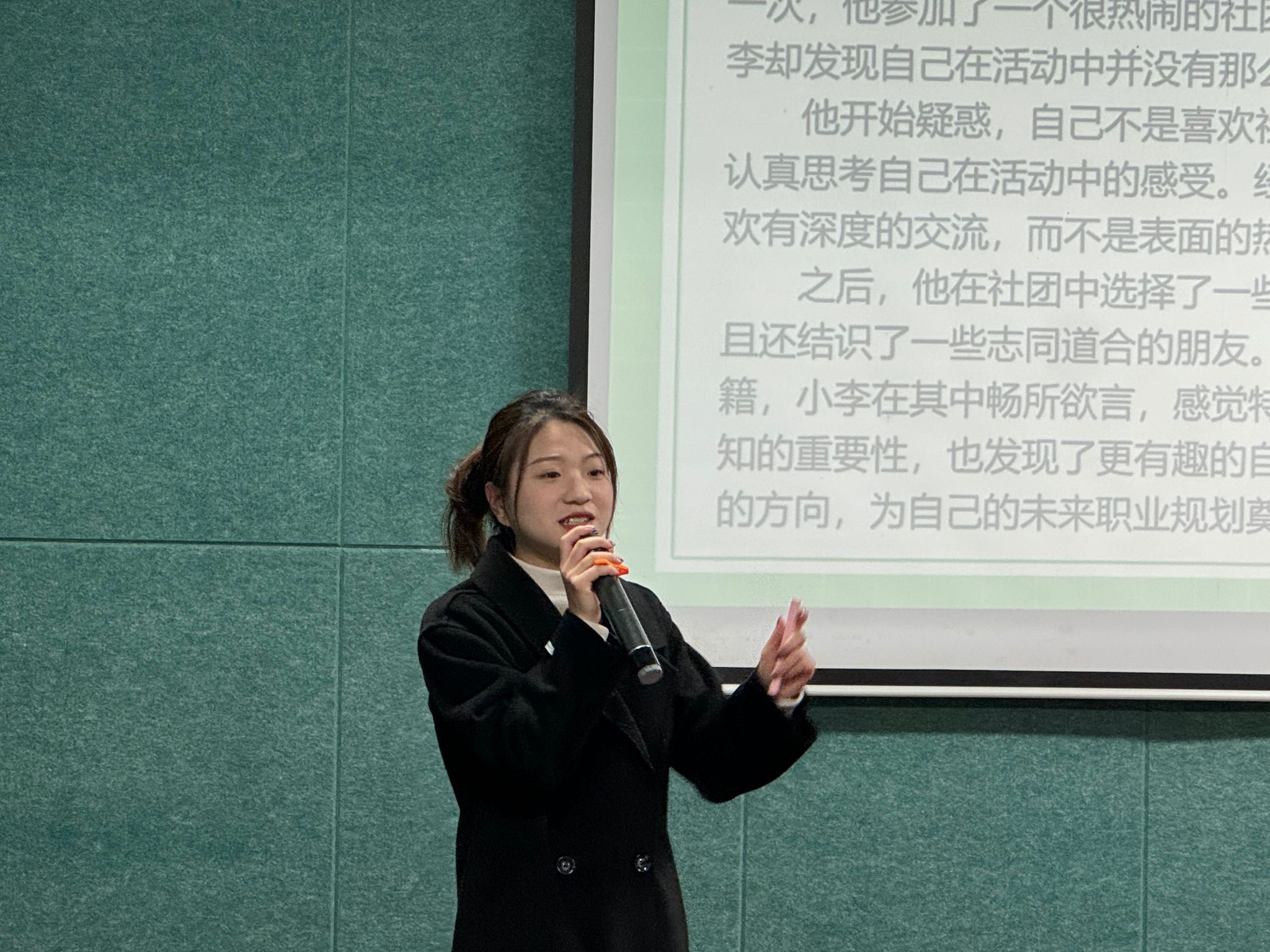 自我认知是深度剖析自我并明晰前行方向的关键。在此次团辅活动中,欧玲灵老师分享大一新生经历迷茫后最终找到自我的小故事,引发同学们思考,让大家意识到了知晓自身爱好与优劣是一场深度内省与持续探索的旅行。自我认知上存在不足是正常的,如何正视才是关键所在。欧玲灵老师鼓励同学们把日常的每一次经历都当作审视自我的镜子,积跬步以成千里,以清晰合理的自我认知推动同学们持续进步。